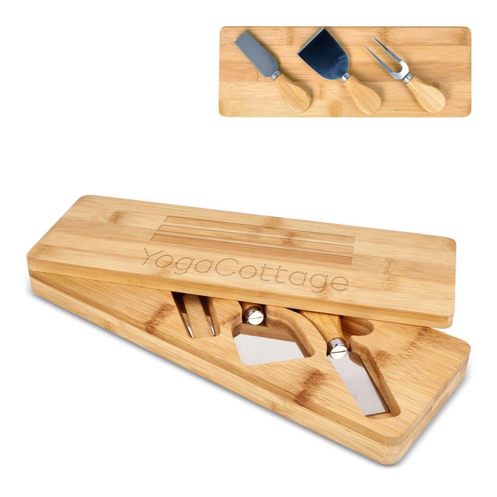 Elevate your brand with the 3pc Bamboo Cheese Serving Set, a premium choice for marketing professionals and event organizers seeking personalized promotional gifts. This elegant set features three specialized knives for soft, semi-hard, and hard cheeses, housed in a sustainable bamboo box that doubles as a stylish serving board.