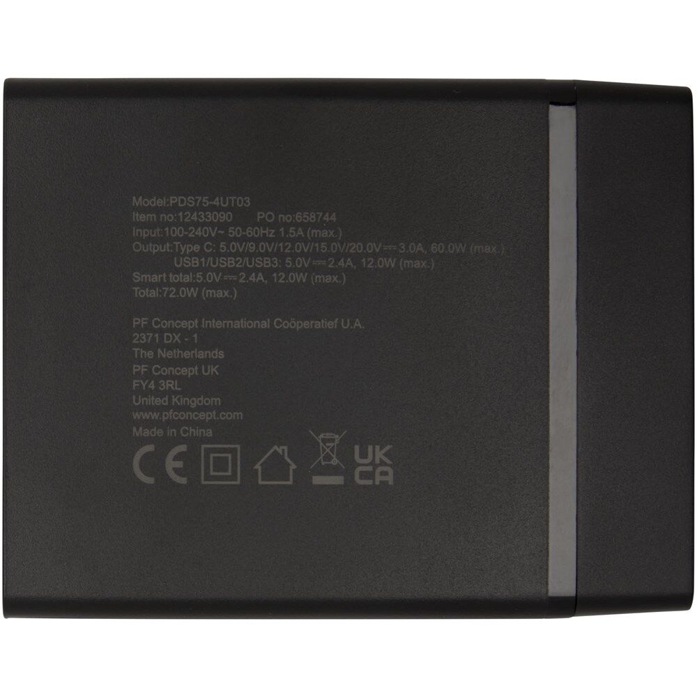 Experience rapid simultaneous charging with three USB-A ports (each 5V/2.4A, 12W max) and one USB-C port supporting 5V/3A, 9V/3A, 12V/3A, 15V/3A, and 20V/3A up to 60W. The combined USB-C and USB-A output reaches 72W, ensuring devices power up efficiently. Includes EU and UK power cords for versatile compatibility (AC 100-240V 50/60Hz).