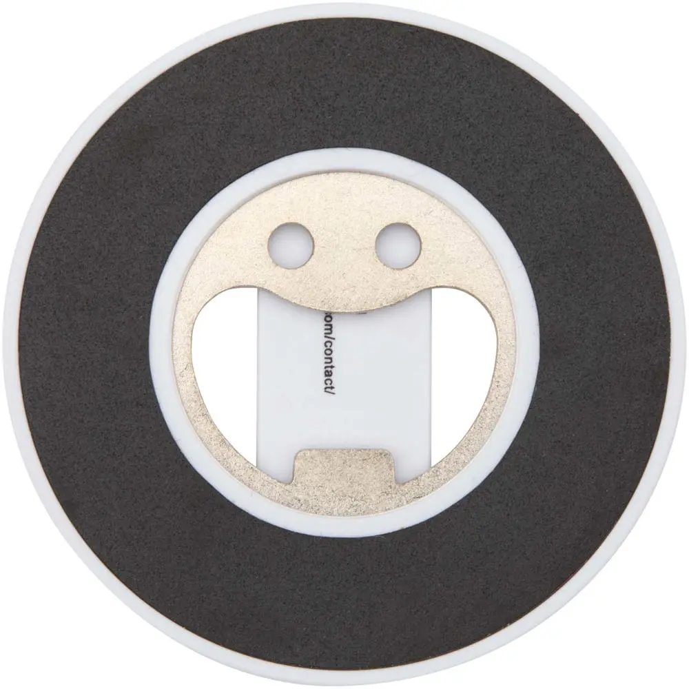 Elevate your brand with the Ain magnetic phone stand and bottle opener, a versatile 2-in-1 promotional gift crafted from sustainable recycled ABS plastic. This compact accessory (Ø 5.76 cm) magnetically attaches securely to iPhone 12 and newer models, serving as a stable phone stand for hands-free viewing during events or daily use. The integrated bottle opener adds practical utility, perfect for on-the-go recipients.