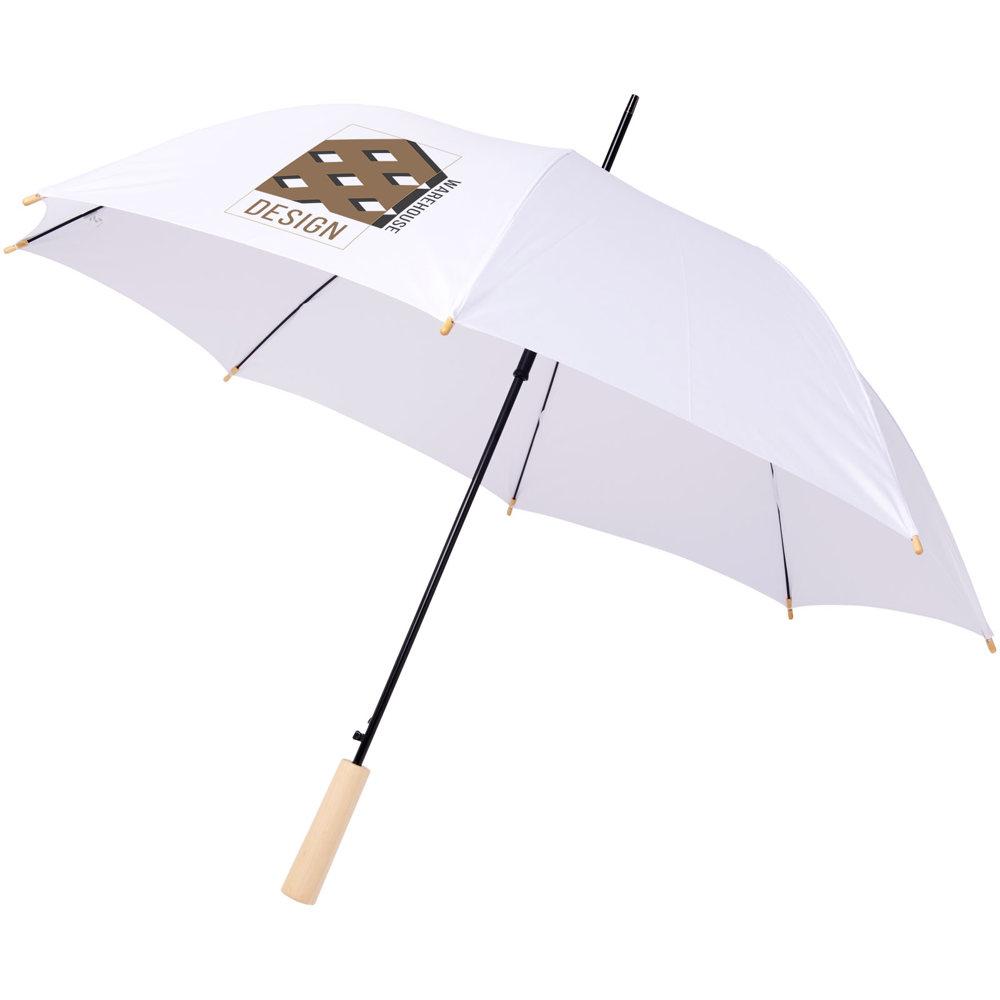 The premium wooden handle and tips add a sophisticated touch, perfect for marketing professionals seeking eco-friendly custom umbrellas with logo printing. With large decoration areas across each panel, this umbrella offers maximum branding exposure, helping you impress recipients and reinforce your company's commitment to sustainability and quality.
