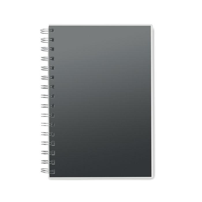 Elevate your brand with this eco-friendly A5 notebook featuring a durable RPET cover made from recycled plastic bottles. Twin-wire binding allows it to lie completely flat for effortless note-taking and easy logo imprinting across the cover.