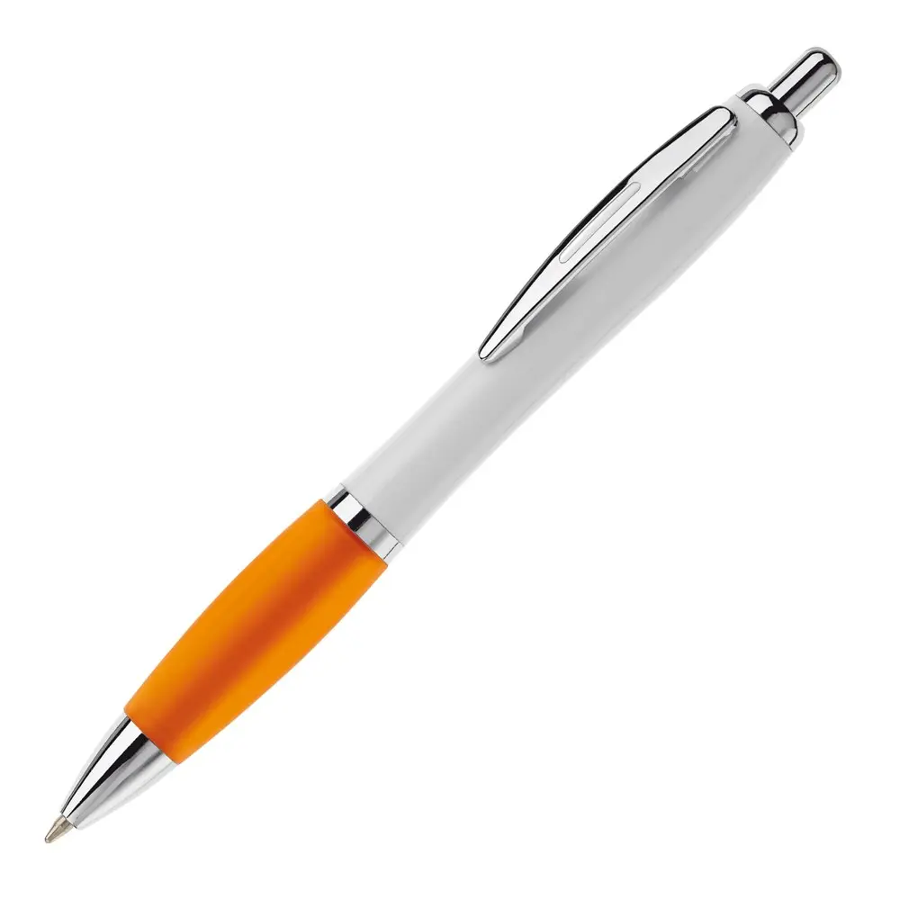 Elevate your branding with this sleek ball pen, featuring a sturdy metal clip for easy attachment to pockets or notebooks. The metal-look push button, ring, and tip add a premium touch, making it perfect for professional giveaways.