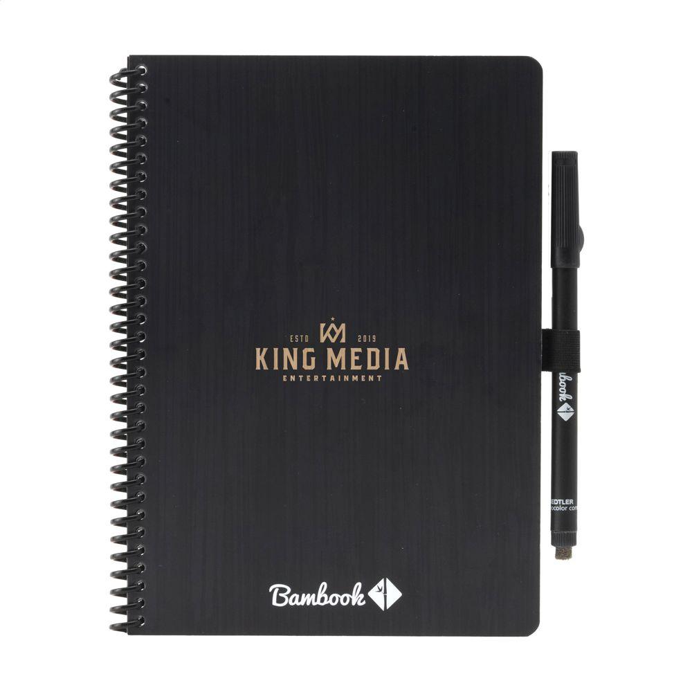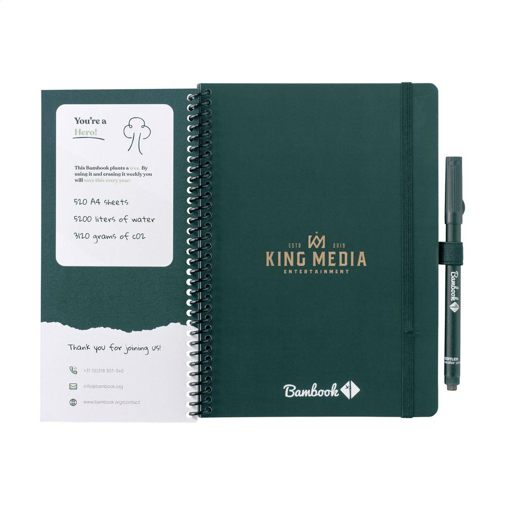 Elevate your brand with the customizable Bambook Classic Original Dot Grid Paper Notebook A5, the ultimate eco-friendly promotional giveaway for marketing professionals and event organizers. Crafted in Holland with a sturdy, bendable cover from FSC-certified cardboard featuring a subtle bamboo pattern, it includes 20 sheets/40 pages of erasable dot grid paper, wire-o binding, and a convenient pen loop.