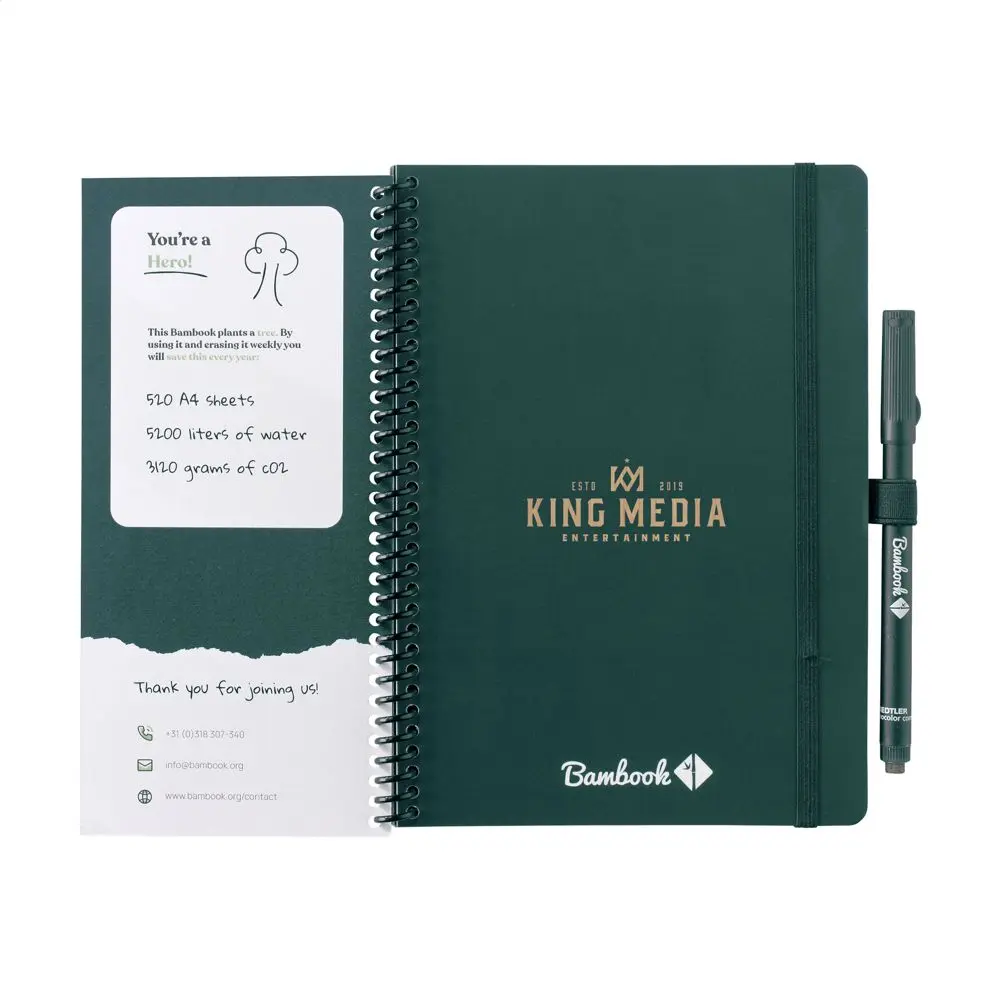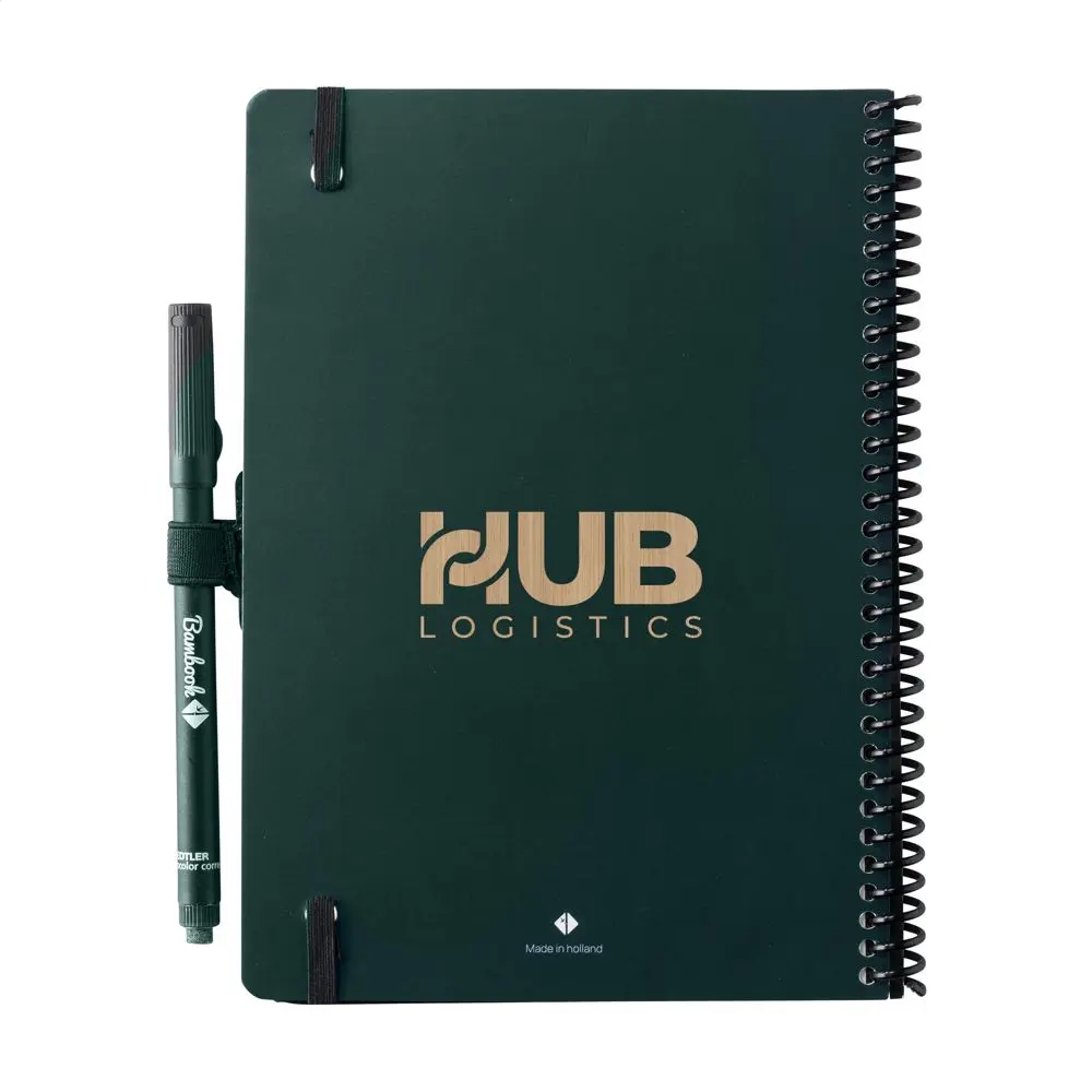 Elevate your brand with the Bambook Classic Original, a reusable A5 notebook designed for businesses seeking sustainable promotional gifts. Crafted from FSC-certified cardboard with a subtle bamboo pattern, this handmade notebook from Holland features a sturdy, bendable cover and wire-o binding for durability on the go.