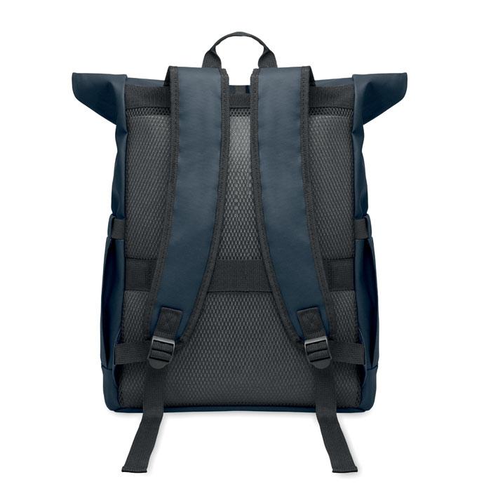 Elevate your brand with this stylish rolltop laptop rucksack, crafted from durable PU-coated 600D RPET polyester with RPET polyester lining for an eco-friendly choice that appeals to sustainability-conscious recipients. Designed to fit a 15-inch laptop securely, it features a meshed padded back panel for breathable comfort during extended wear, a zippered pocket for quick-access essentials, and a practical trolley strap for seamless travel with luggage.