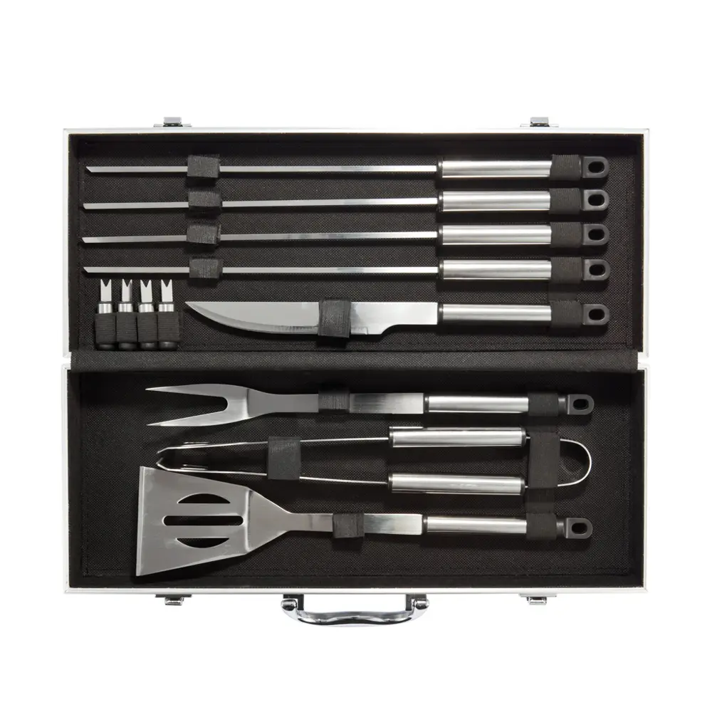 Elevate your brand visibility at outdoor events with this comprehensive 12-piece stainless steel barbecue set. Designed for durability and convenience, it includes four skewers, a carving knife, four corn holders, a spatula, a carving fork with protective cover, and a pair of tongs. All tools pack neatly into a sturdy aluminum case with hinges and a handle, making it easy to transport and store.