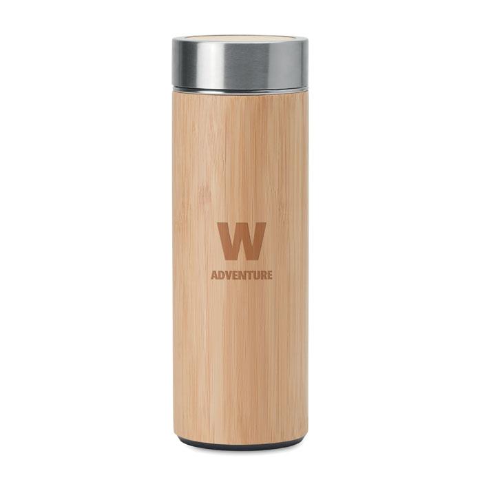 Elevate your brand with this premium double wall stainless steel vacuum flask featuring a natural bamboo cover and built-in tea infuser. With a 400 ml capacity, it keeps beverages hot for hours or cold throughout the day, making it ideal for promotional giveaways, corporate events, or client appreciation gifts.