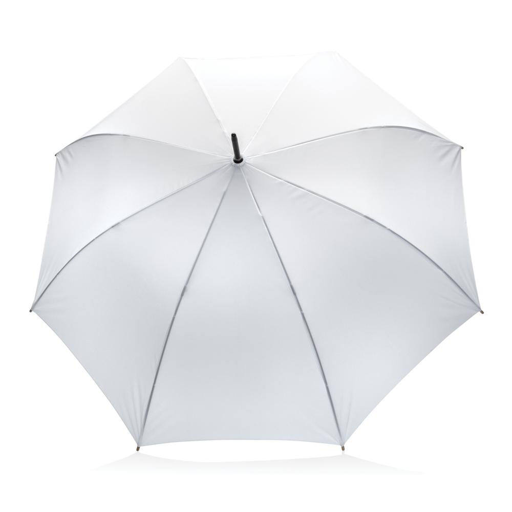Elevate your brand's eco-conscious image with the Biba auto open umbrella featuring a stylish bamboo handle. Crafted from 190T RPET pongee fabric certified by AWARE™ tracer technology, it guarantees genuine recycled materials and verified water savings through blockchain validation—equivalent to 10.7 PET bottles (500ml) per canopy.