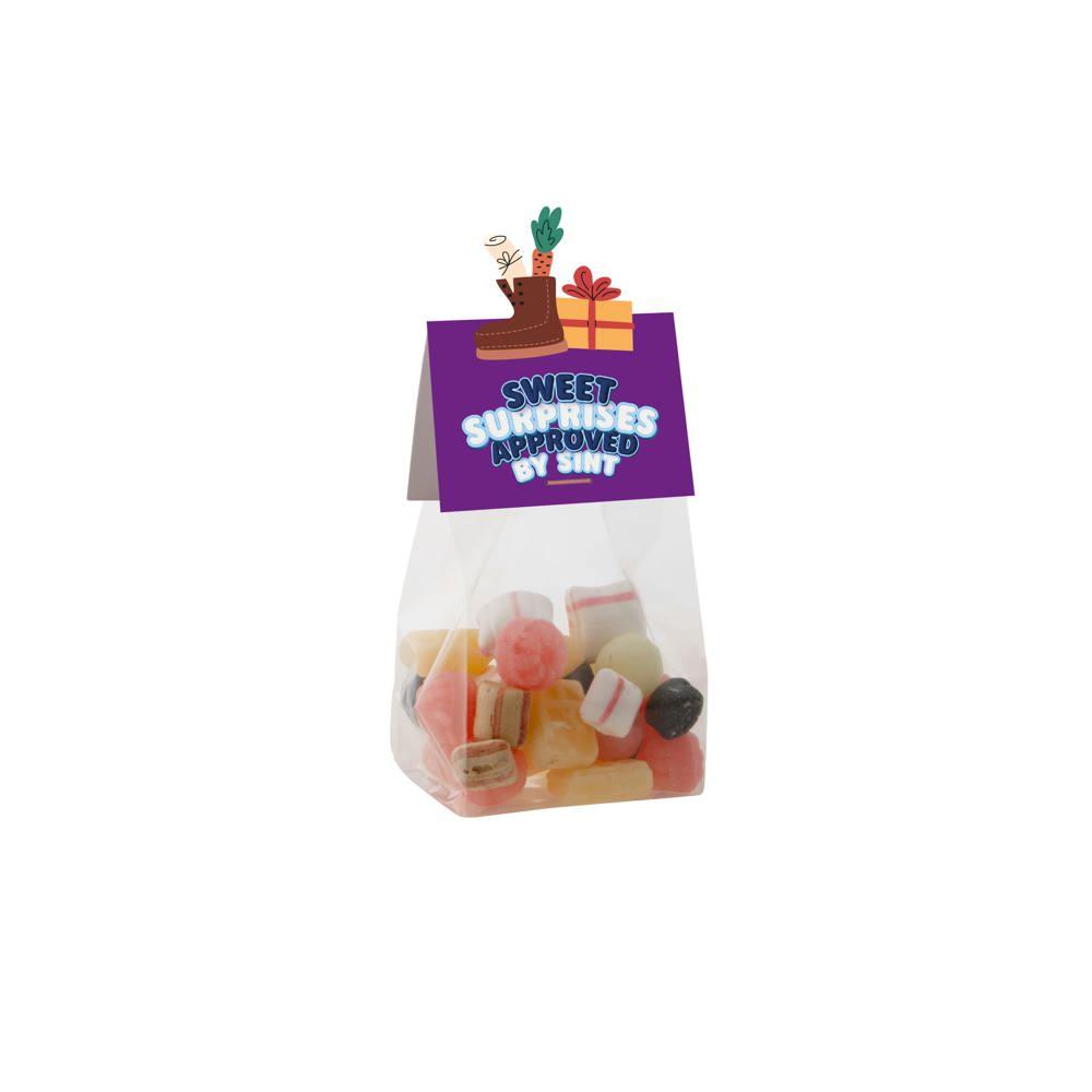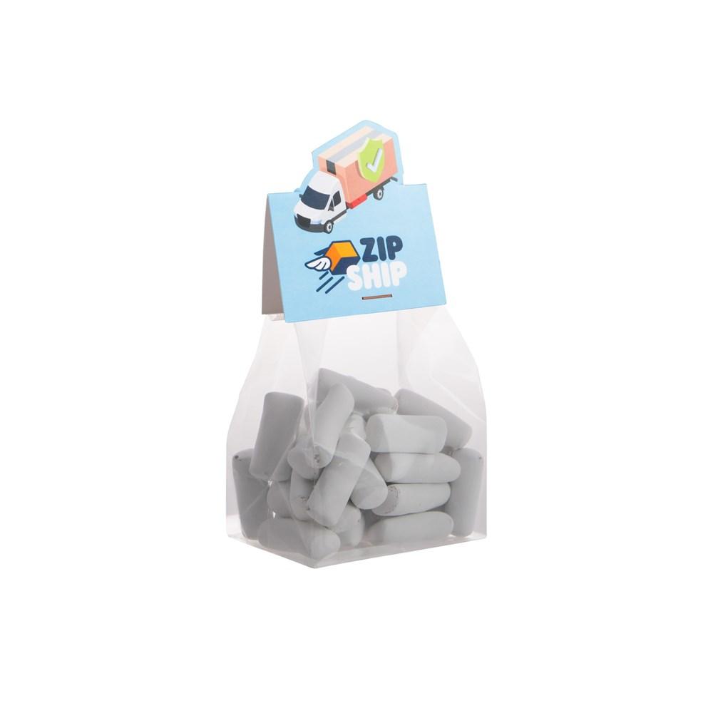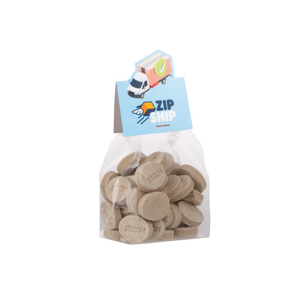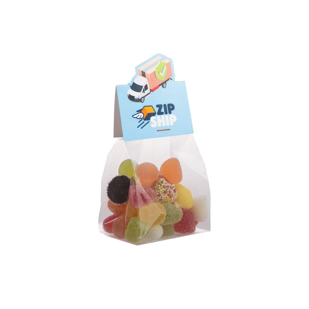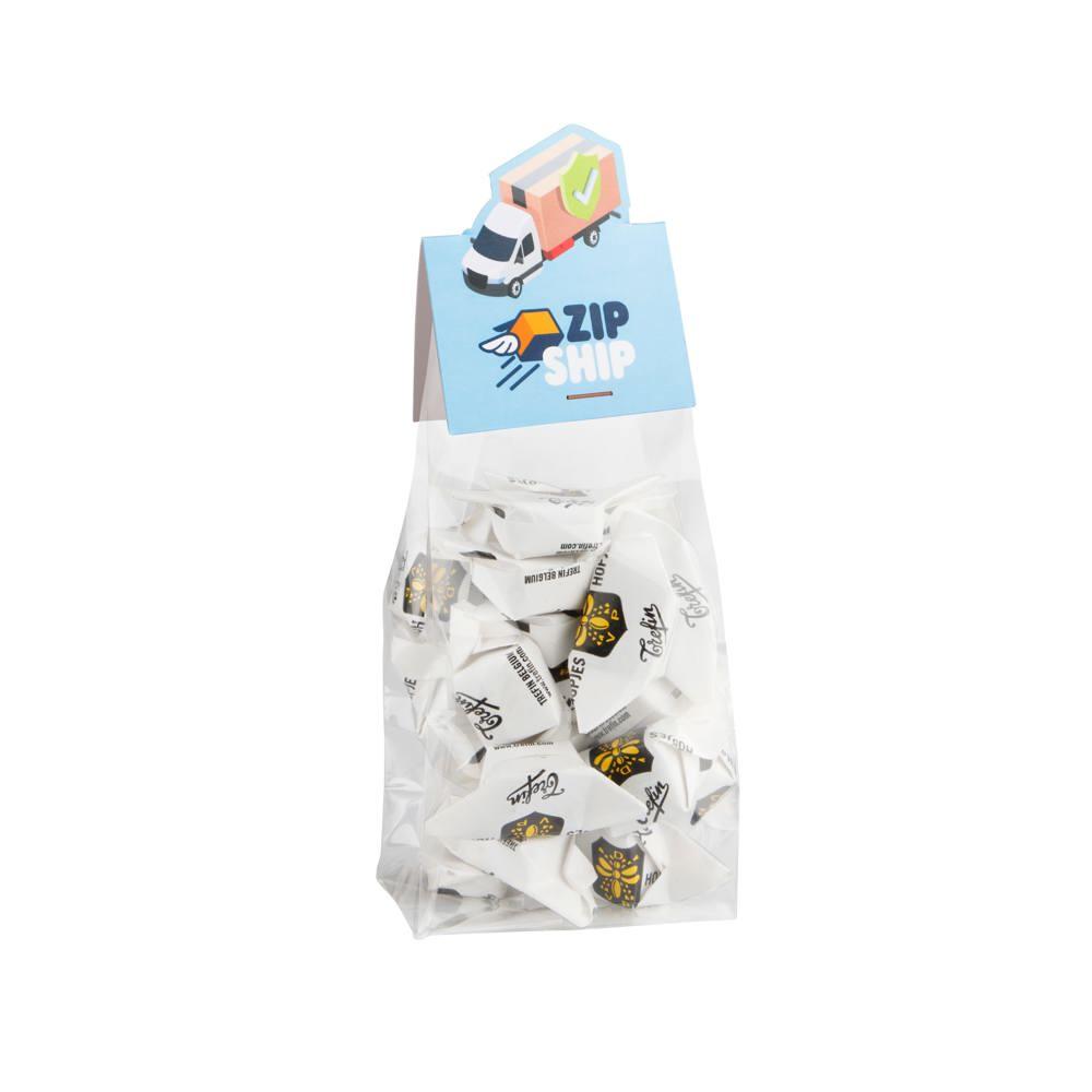 Impress your clients and boost brand visibility with our customizable block bag, featuring a full-color printed header card in your own unique shape. Filled with 100 grams of premium licorice sticks mix, this eye-catching giveaway combines delicious indulgence with standout personalization.