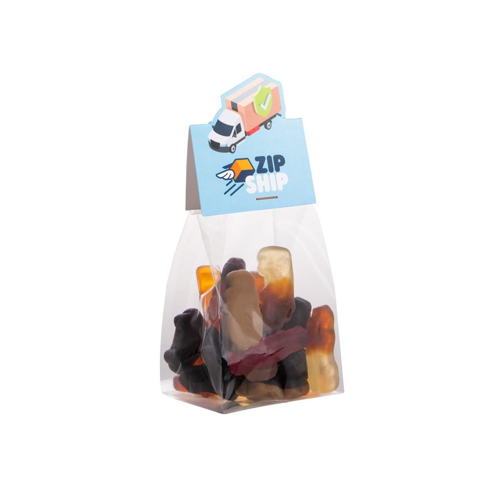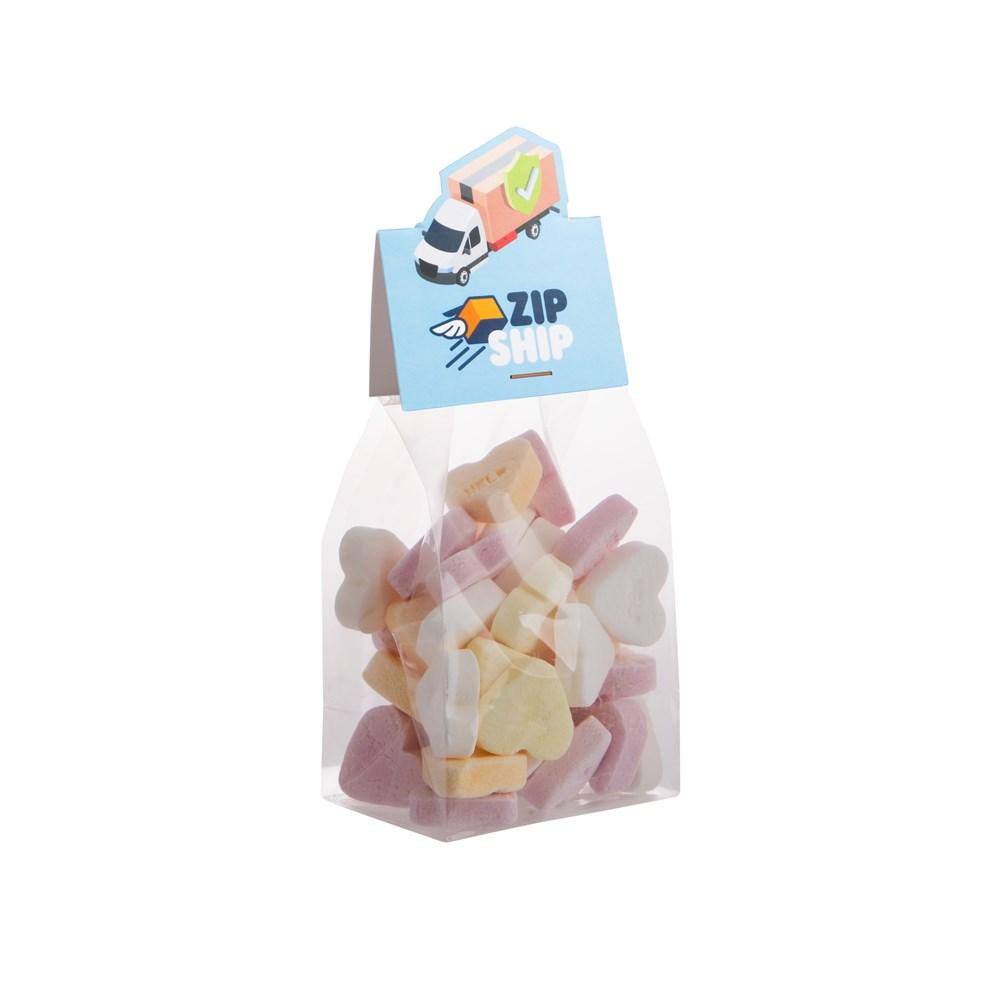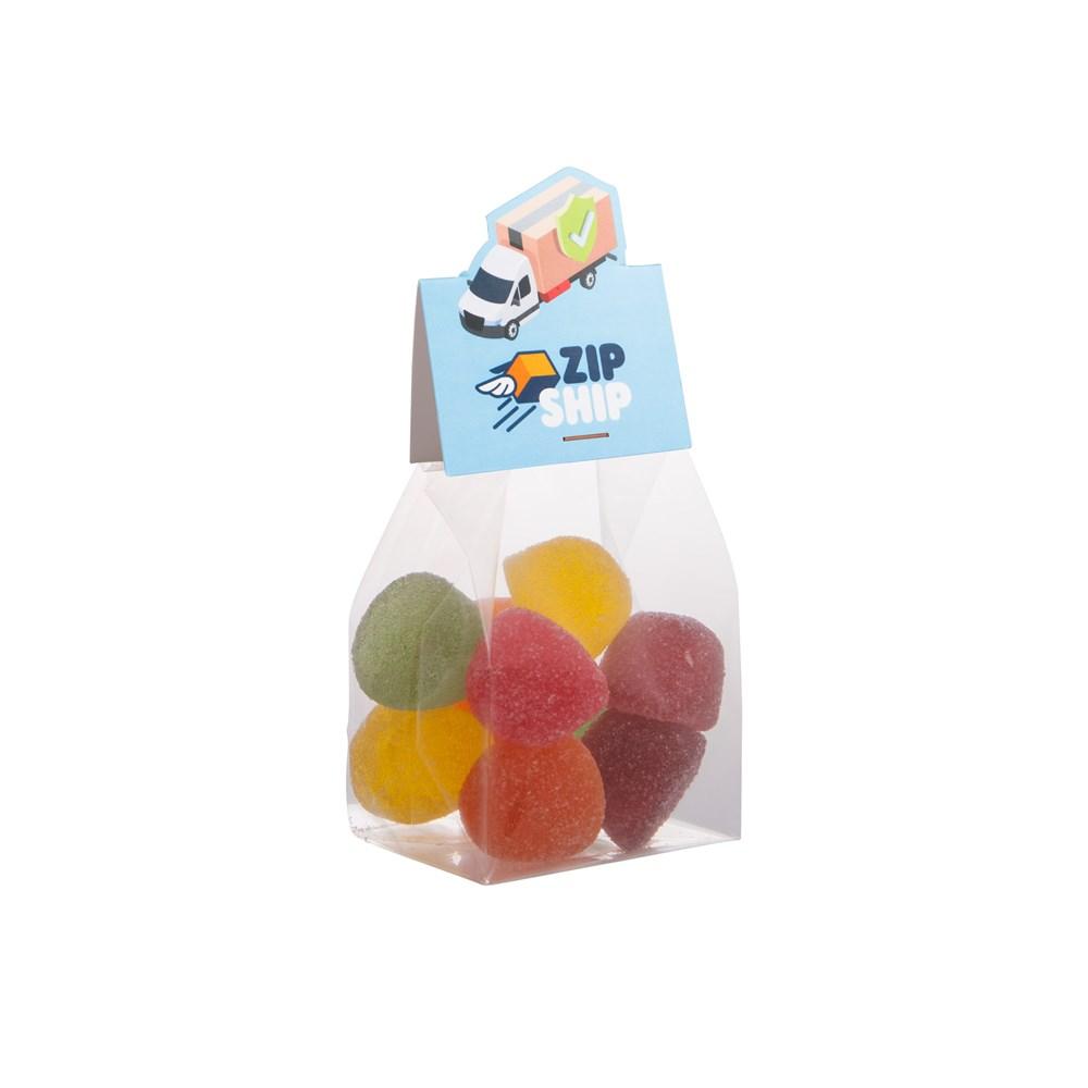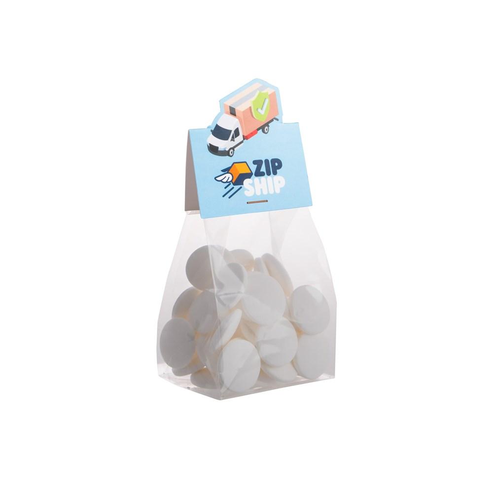 Impress your clients and boost brand visibility with our customizable block bag, featuring a full-color printed header card in your own unique shape. Filled with 100 grams of premium licorice sticks mix, this eye-catching giveaway combines delicious indulgence with standout personalization.