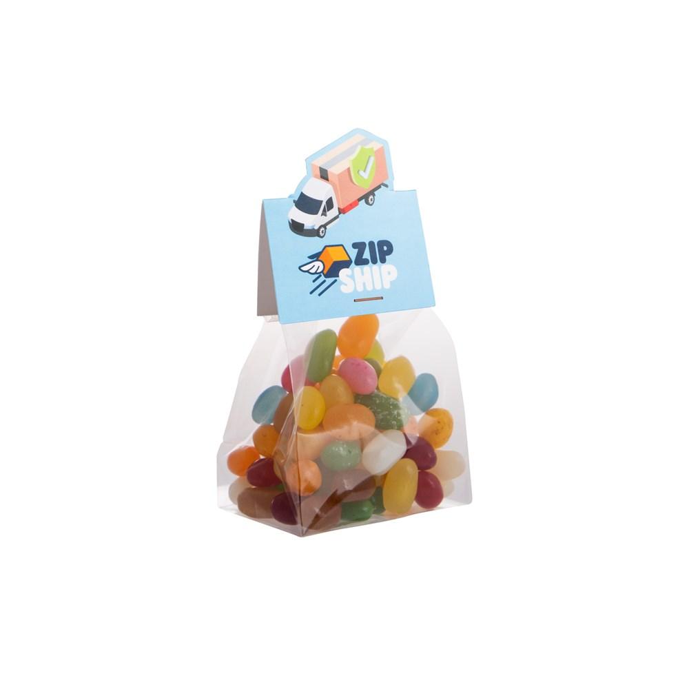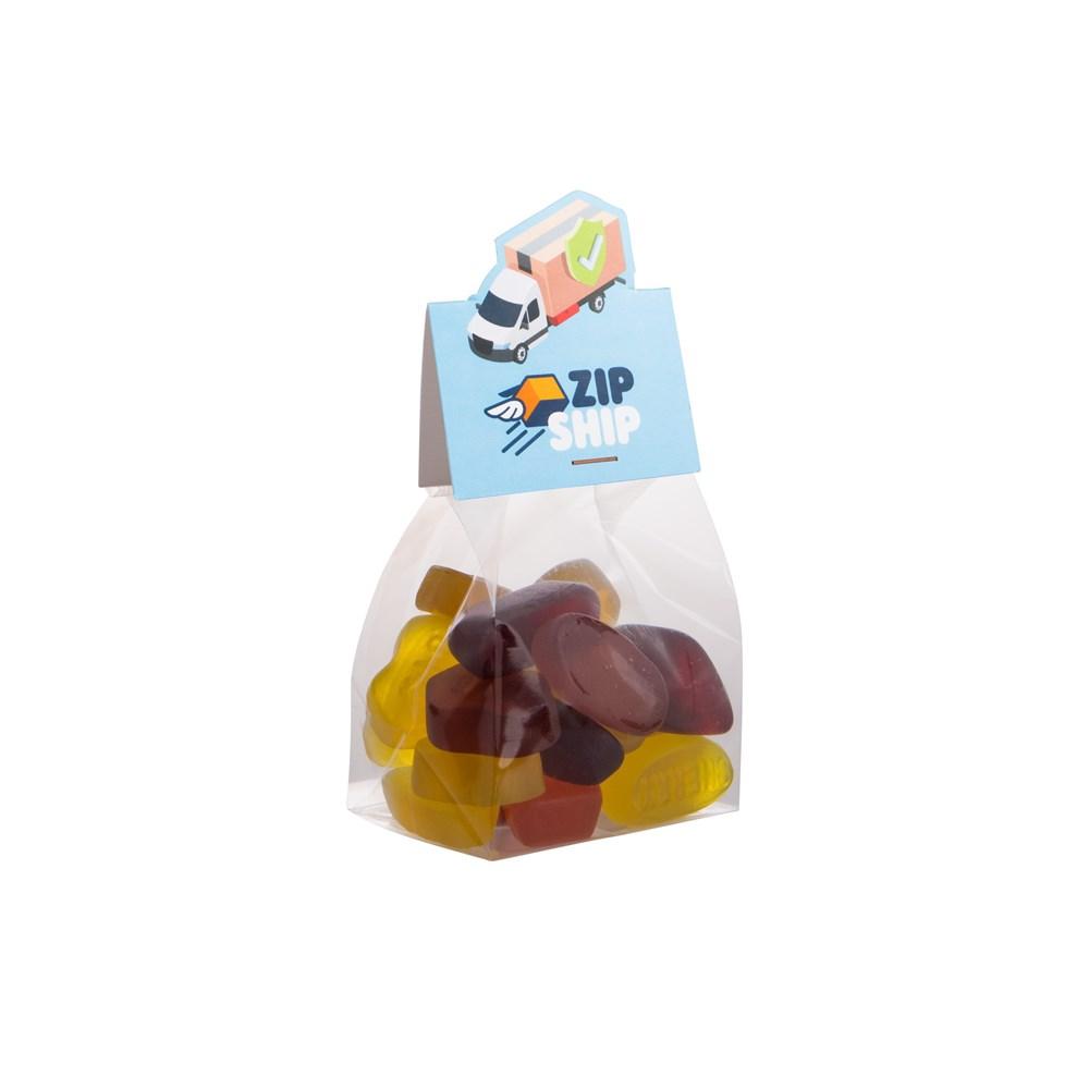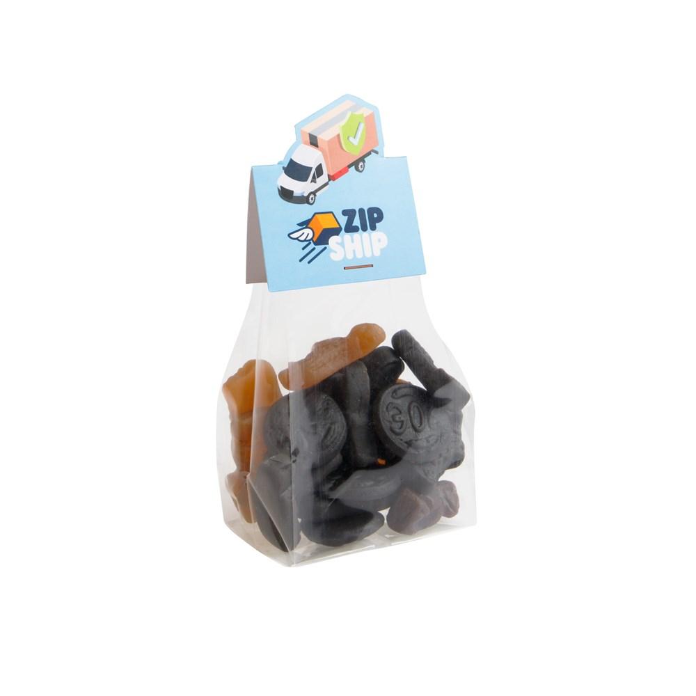 Elevate your promotional giveaways with this transparent block bag, featuring a fully customizable full-color printed header card in your own unique shape. Filled with 100 grams of assorted licorice sticks mix, it's the perfect branded treat for events, trade shows, or client appreciation.