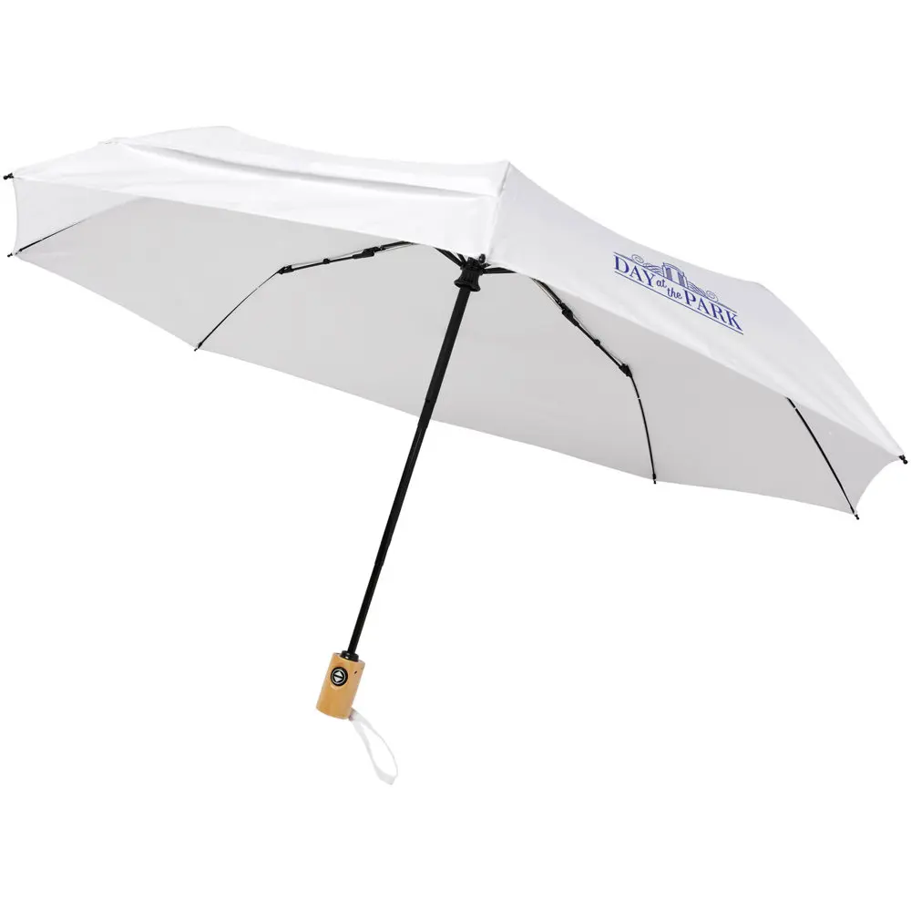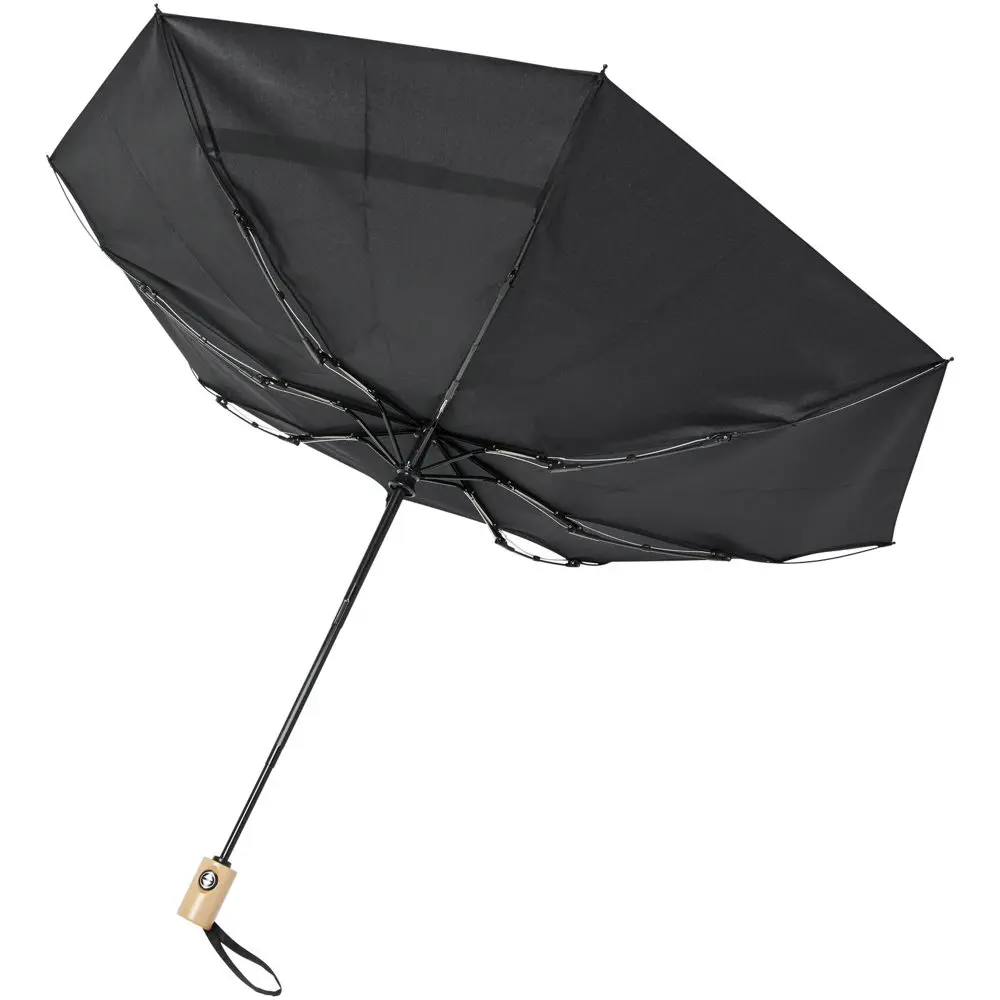 Crafted from recycled PET pongee polyester canopy, this umbrella embodies environmental responsibility. The sturdy metal shaft and high-quality frame with fibreglass ribs ensure durability and flexibility, even in gusty winds. The wooden handle adds a natural, premium touch, aligning with eco-conscious branding.