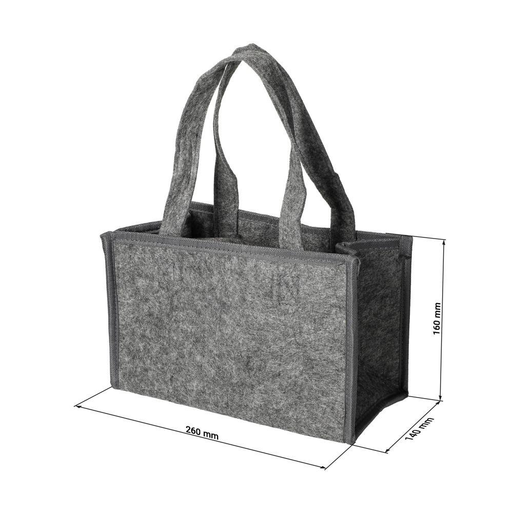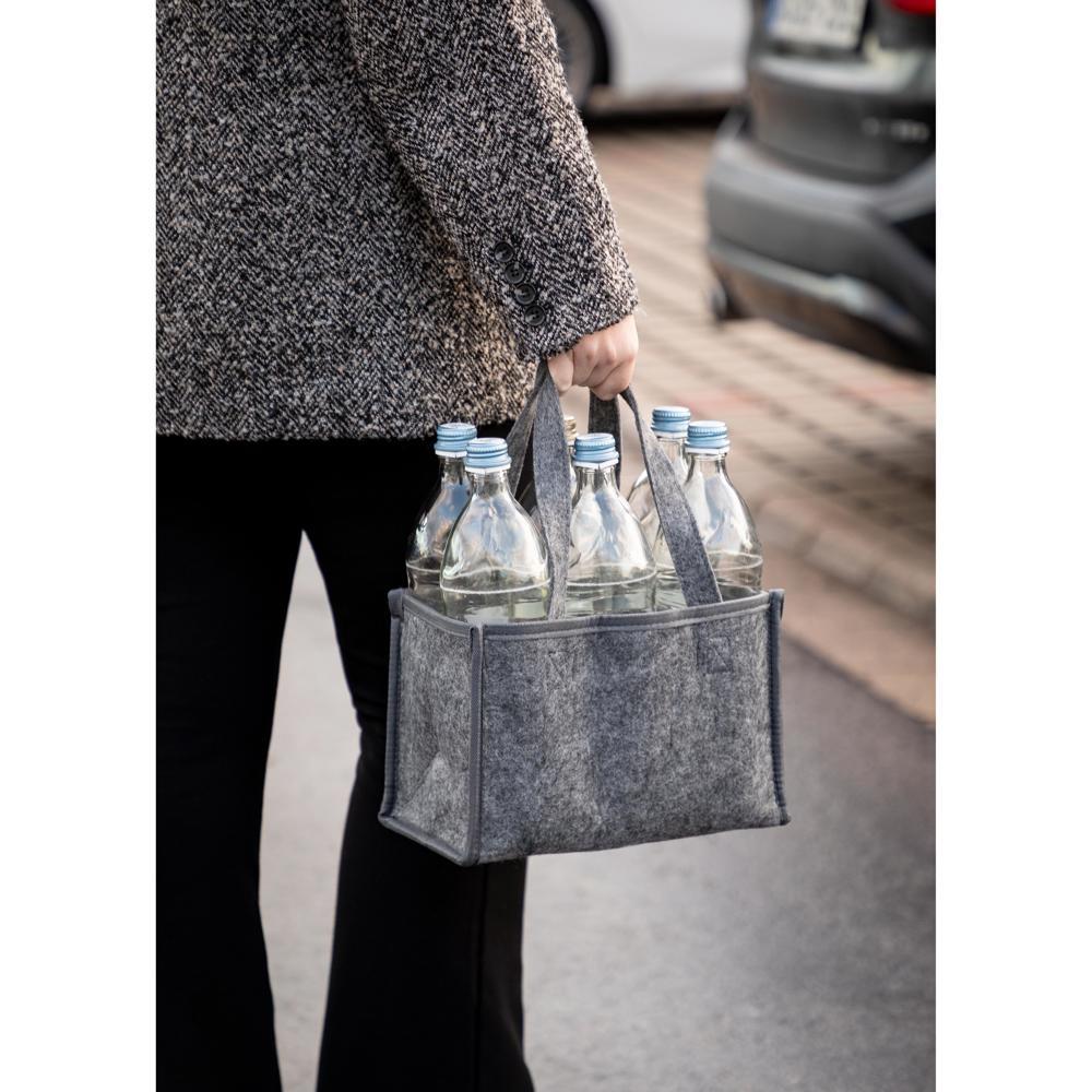 Elevate your promotional game with the customizable Bottle Bag "Felt", crafted from durable recycled polyester felt for eco-conscious branding. Securely hold up to 6 drink bottles (max 0.7L each) thanks to built-in dividers that eliminate clinking and shield against damage, ensuring drinks arrive in perfect condition.