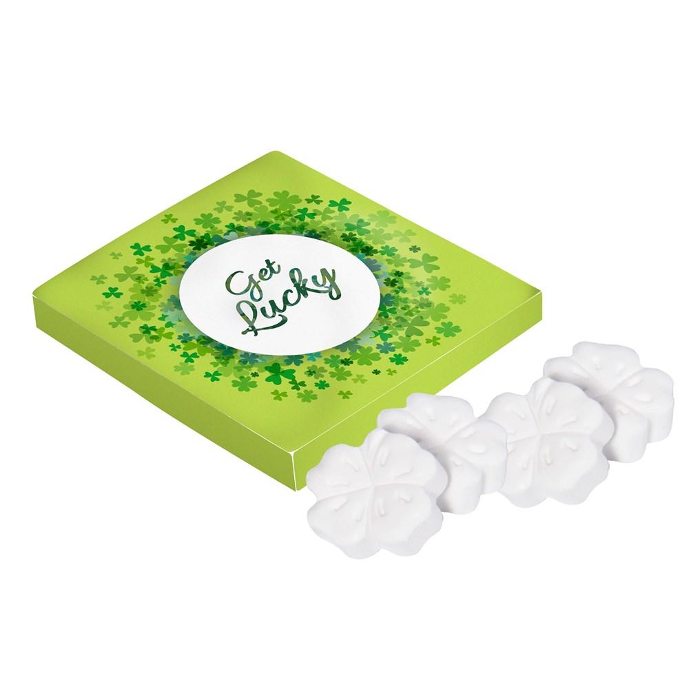 Elevate your promotional giveaways with this custom full-colour printed square box, perfectly filled with 4 delightful clover-shaped mints. Ideal for marketing professionals and event organizers, these branded treats offer a unique branding opportunity that combines freshness and luck symbolism.