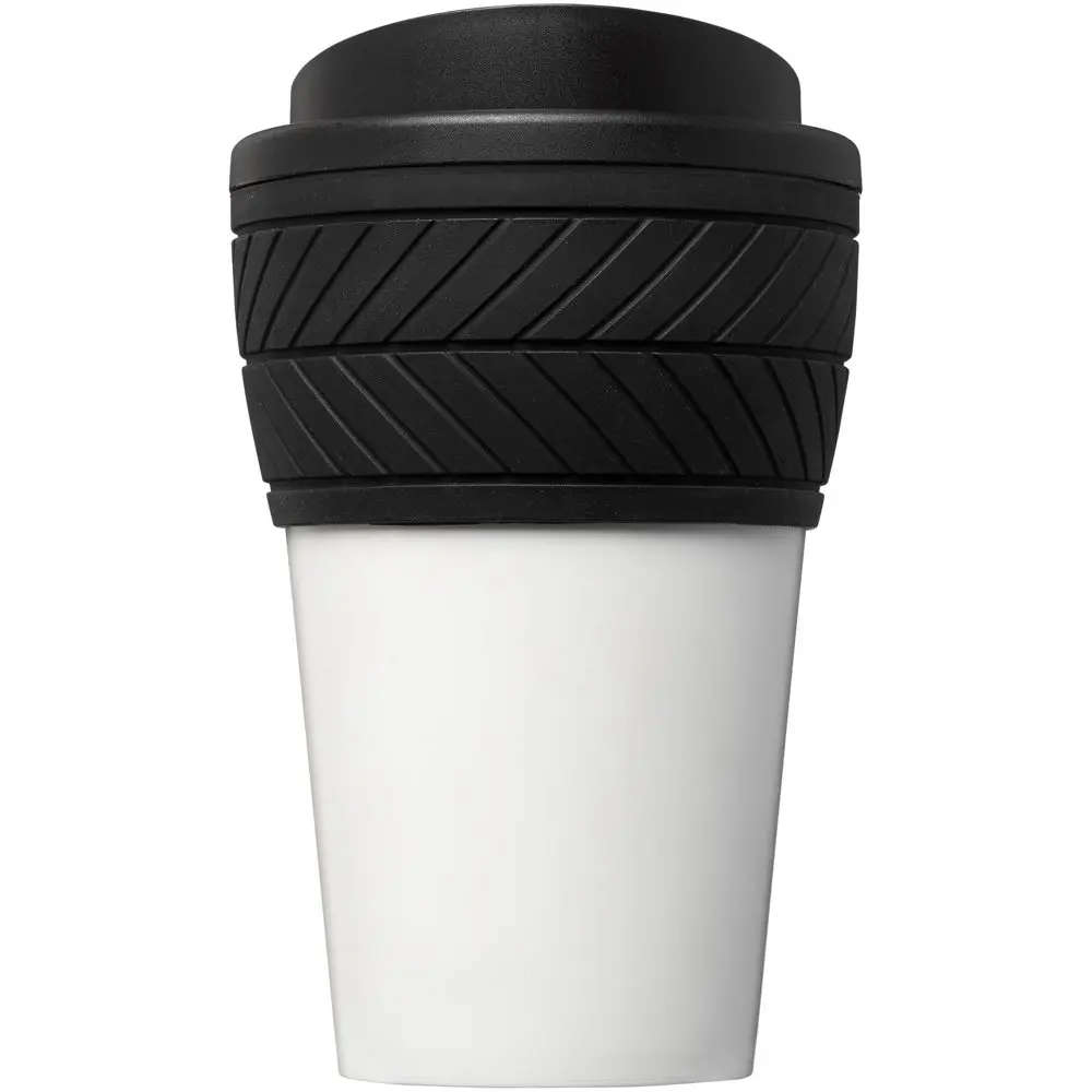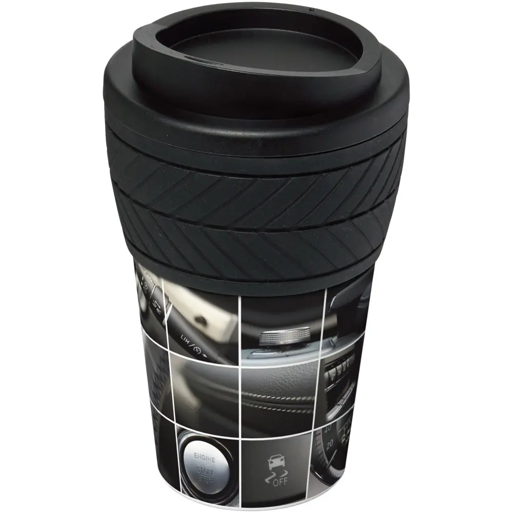 This tumbler holds 350 ml and measures 15.4 x 9.45 cm, featuring a twist-on lid for secure sipping and a tyre design silicone grip for comfortable handling. Crafted from PP plastic and silicone, it includes a full colour wraparound design that's moulded directly onto the surface for scratch-resistant, long-lasting personalization with your company logo.