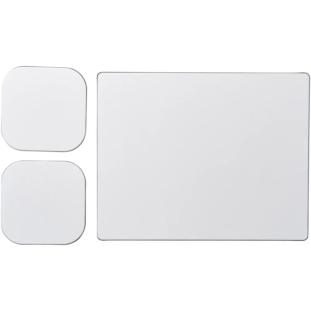 This combo includes a rectangular mouse mat measuring 0.3 x 19 x 24 cm and two square coasters at 0.3 x 9.5 x 9.5 cm. Crafted from recycled plastic and laminated paper, it meets FSC compliance standards for sustainable sourcing.