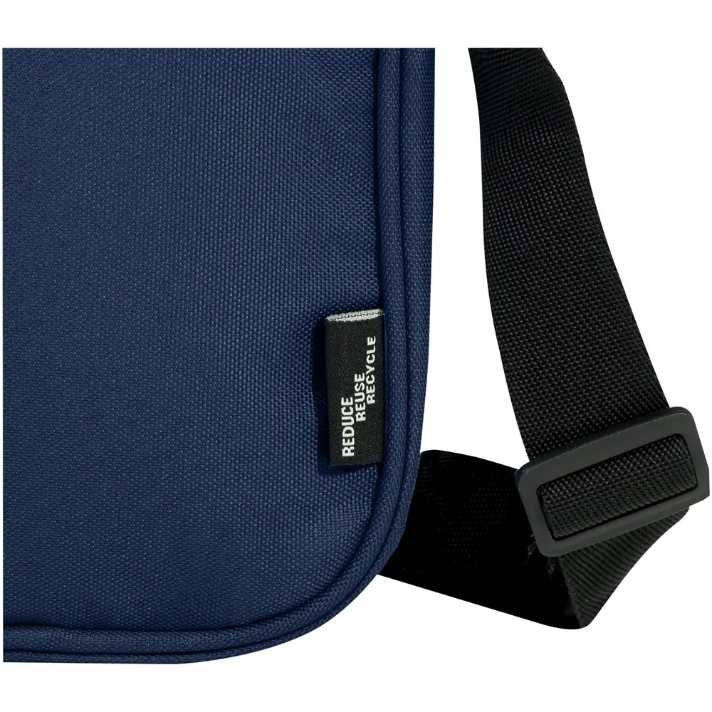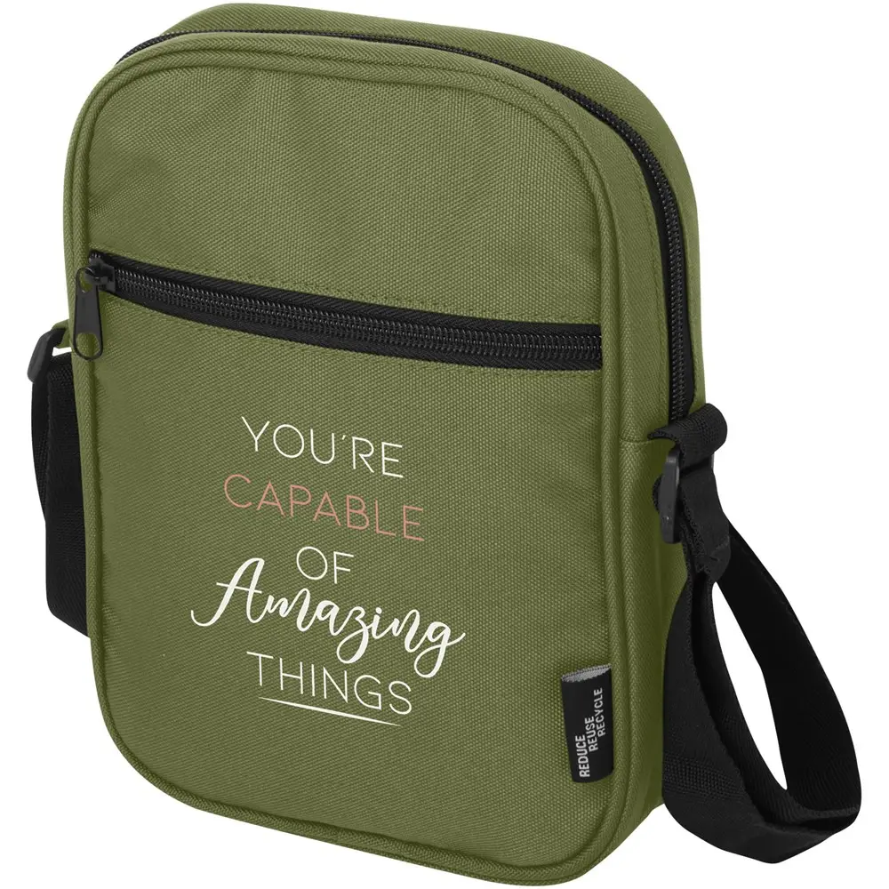 Elevate your brand's visibility with this versatile crossbody bag, designed for everyday use and perfect for corporate gifting. Made from GRS certified recycled polyester, it combines functionality with sustainability, making it an ideal choice for marketing campaigns and events. At 17 x 23.5 x 5 cm and with a 2L capacity, it's compact yet spacious enough to carry essentials without bulk.