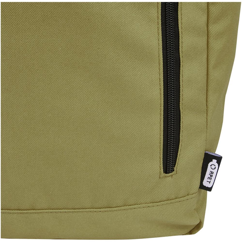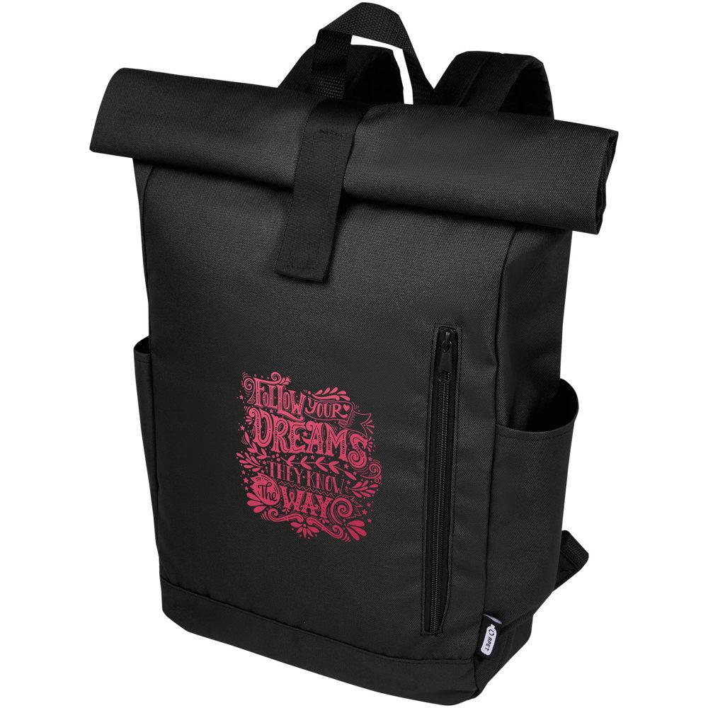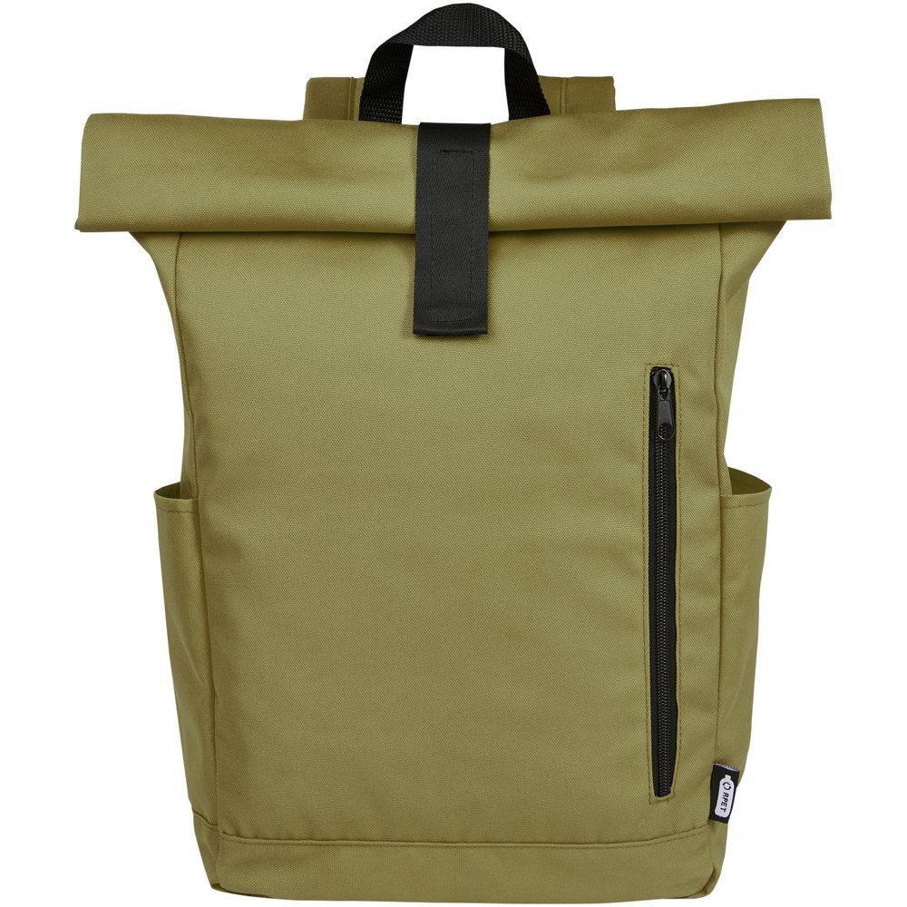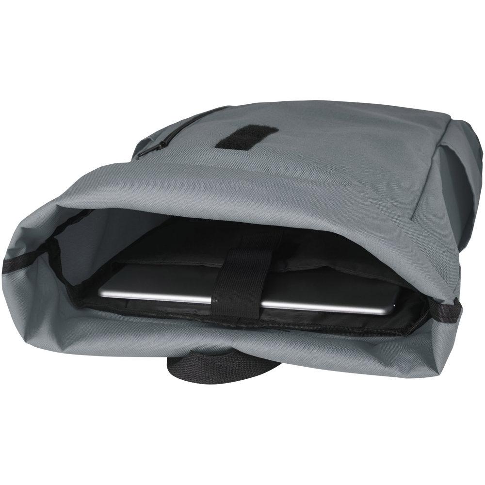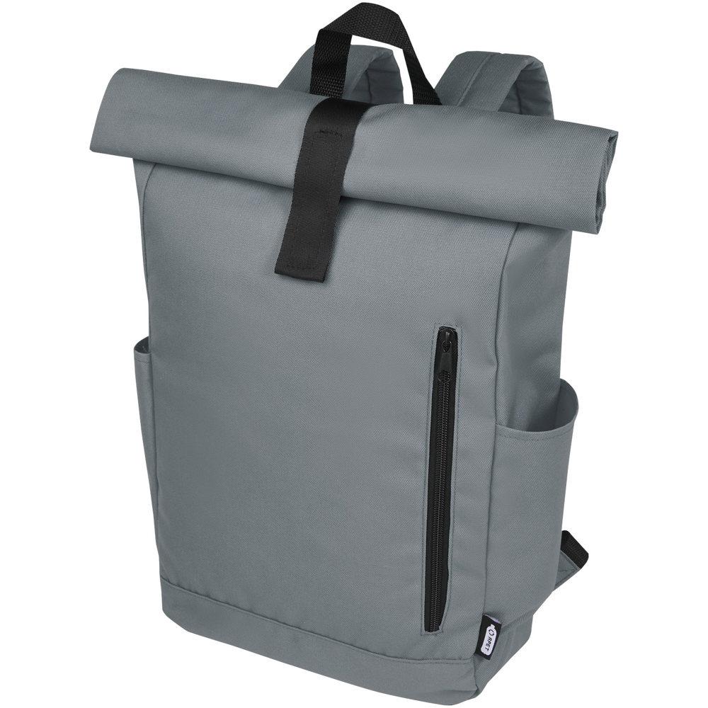 Elevate your brand visibility with the Byron 15.6" roll-top backpack 18L, a practical and sturdy promotional essential crafted from GRS recycled polyester for a minimal ecological footprint. Ideal for marketing professionals and event organizers, this customizable backpack features a spacious 18L main compartment with dedicated 15.6” laptop sleeve, zippered front pocket, and two side pockets for ultimate convenience.