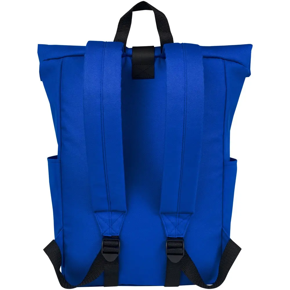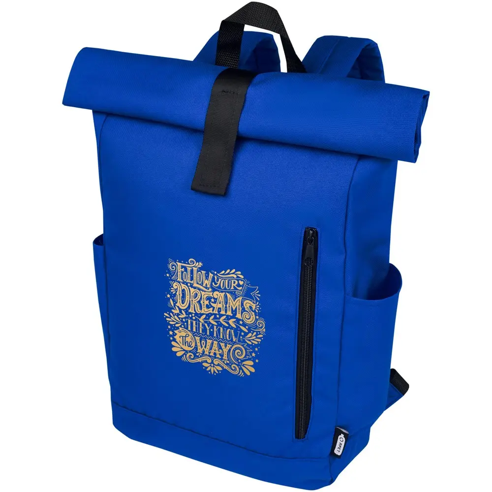 Elevate your brand's visibility with the Byron 15.6" roll-top backpack, a sustainable promotional essential crafted from GRS-certified recycled polyester. This 18L durable, water-repellent bag (11 x 41 x 28 cm) features a spacious main compartment with a dedicated 15.6" laptop sleeve, zippered front pocket, and two side pockets for organized storage. Adjustable padded shoulder straps, padded back panel, carrying loop, and secure hook-and-loop roll-top closure ensure comfort and reliability for daily commutes or events.