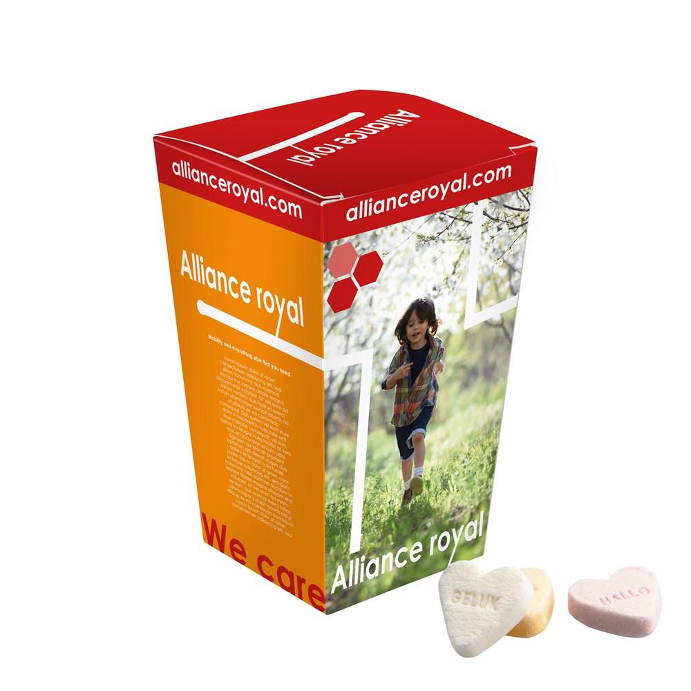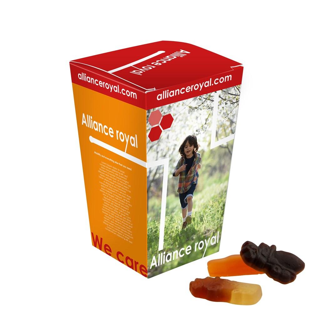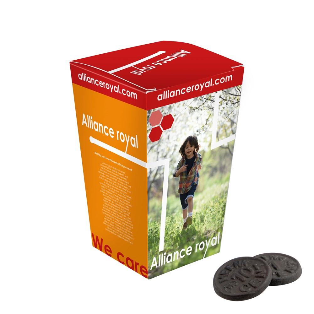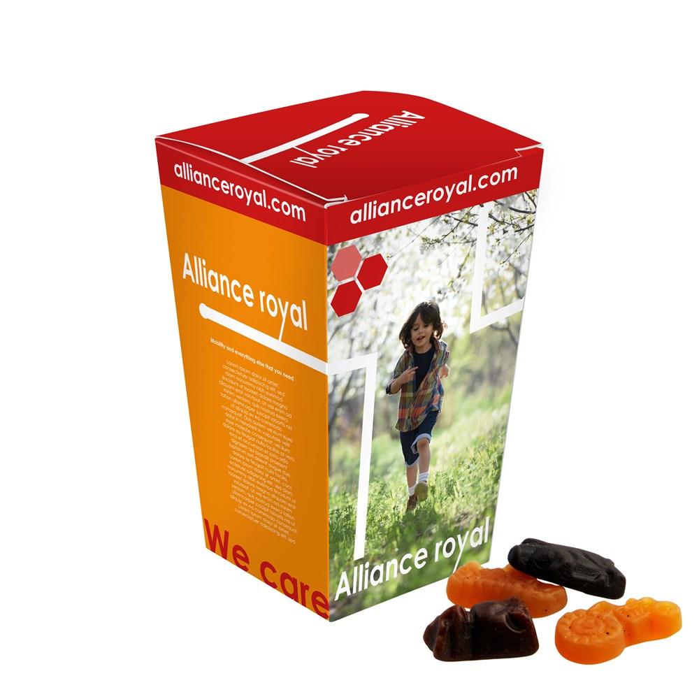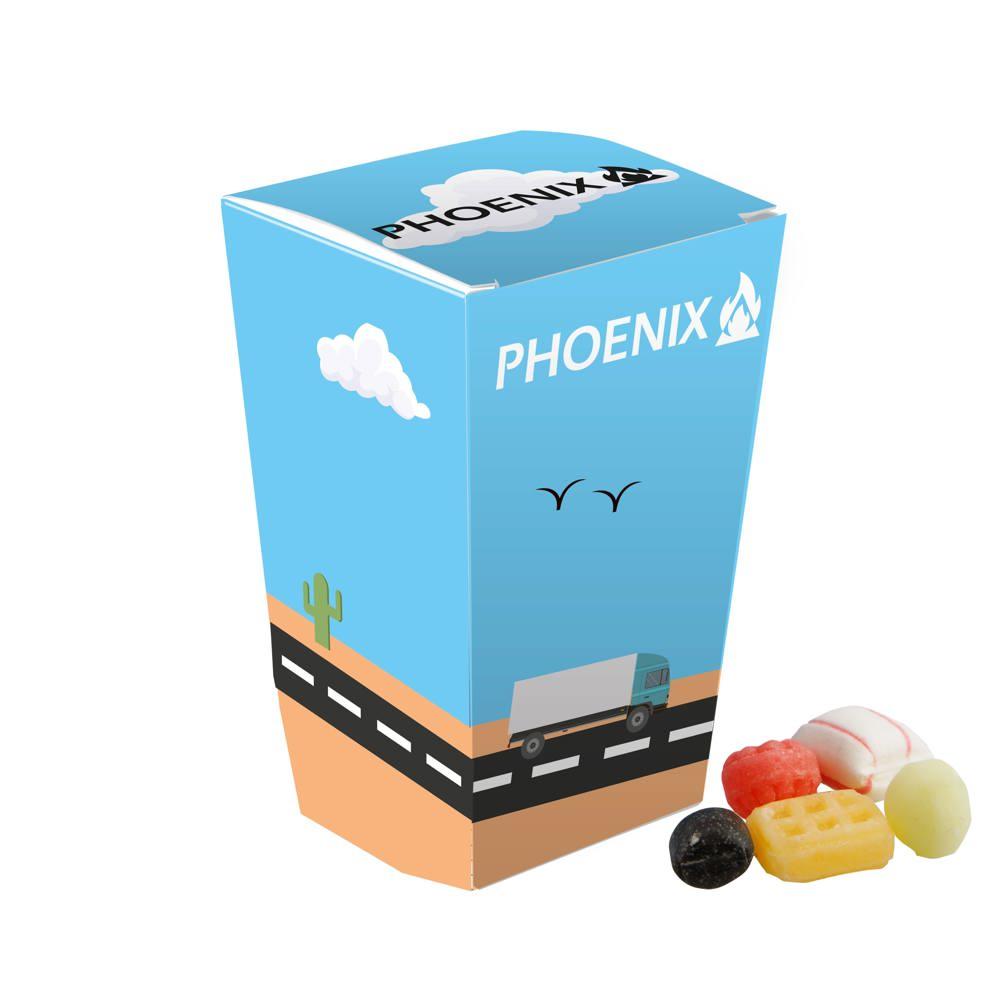 Elevate your promotional giveaways with this full color printed box designed to fit perfectly in car cup holders. Filled with approximately 250 grams of assorted licorice sticks mix, it offers a delightful treat that keeps your brand visible during drives.