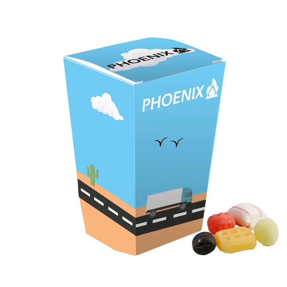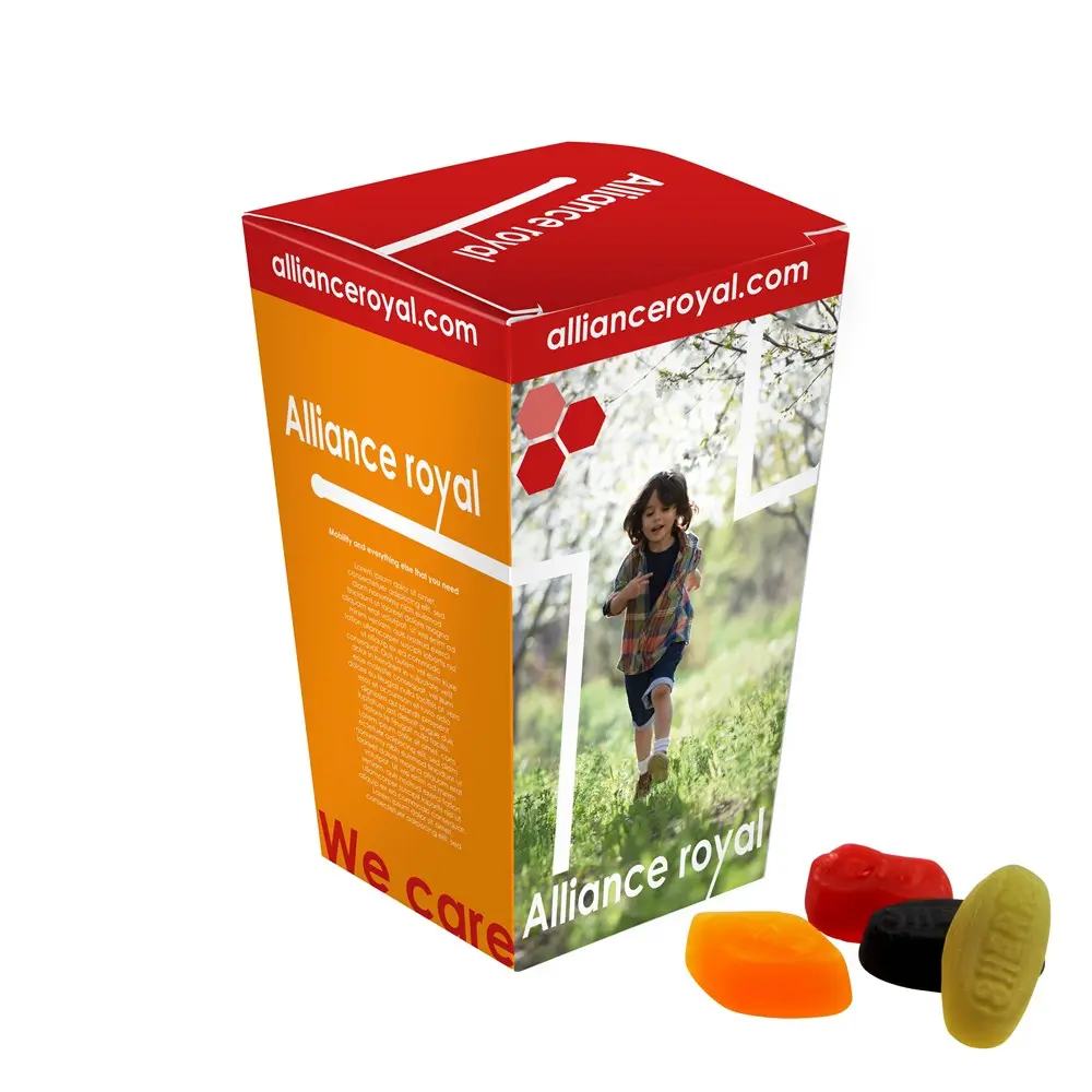 Elevate your branding with this innovative full-color printed paper box designed to fit perfectly in car cup holders. Filled with approximately 250 grams of assorted licorice sticks, it offers a delightful mix of flavors that keeps recipients engaged on the go.