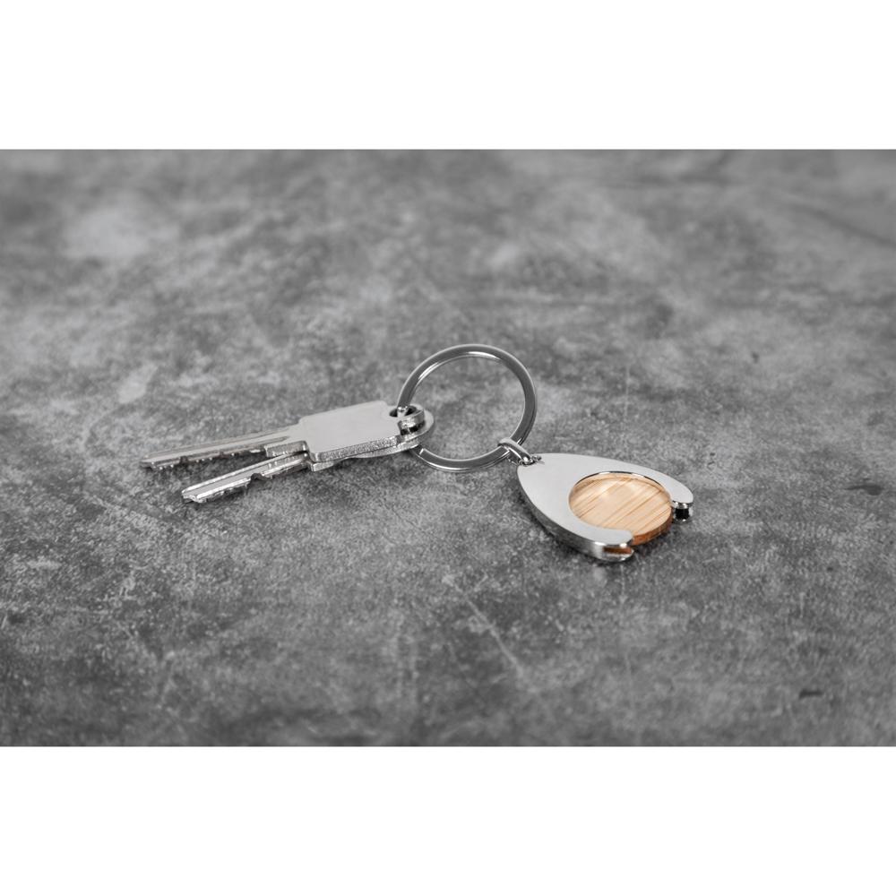 Elevate your promotional giveaways with this stylish metal keychain featuring an integrated bamboo trolley token (Ø 24 mm). Complete with a sturdy keyring, it's the perfect blend of functionality and eco-friendliness for everyday use.