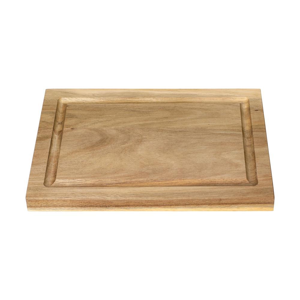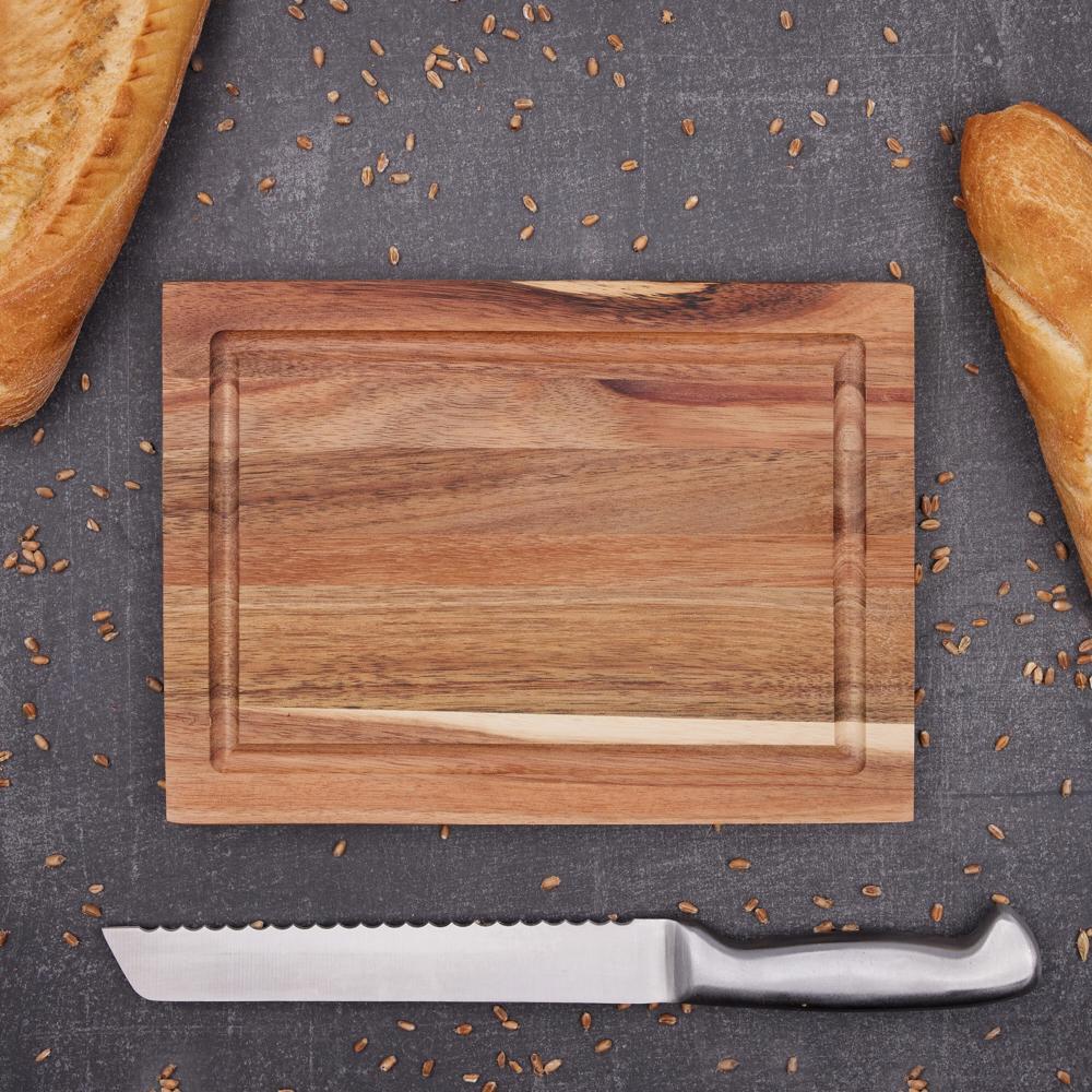Elevate your brand with our personalized acacia chopping board, a premium kitchen essential crafted from sturdy acacia wood treated with natural soybean oil for lasting durability and easy maintenance. Featuring a practical grooved juice rim to catch liquids and two lateral grip indentations for secure handling, this versatile cutting board is ideal for everyday use and makes an unforgettable promotional giveaway.