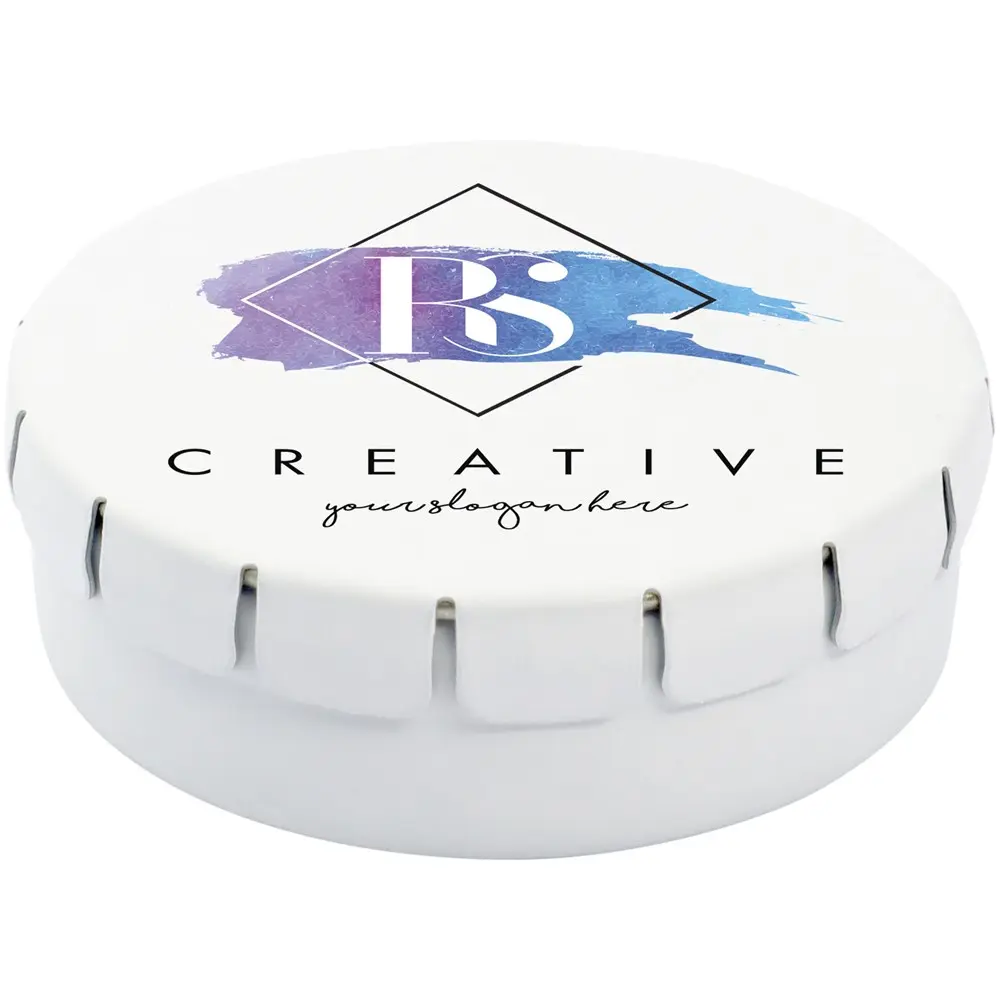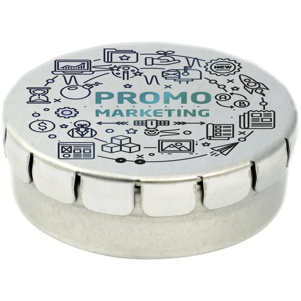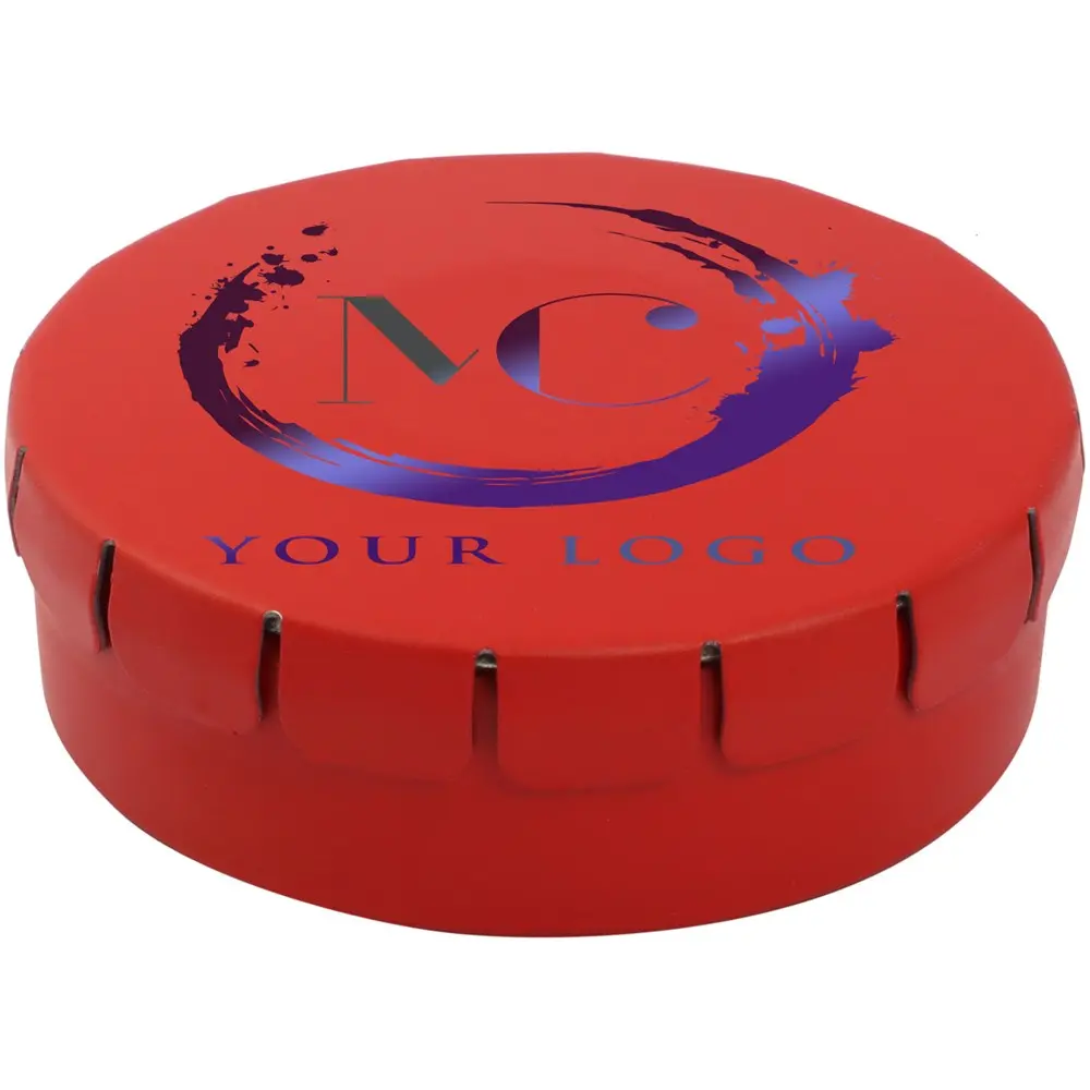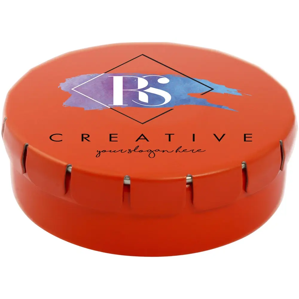 Cinnamon flavour sweets in tin container with easy-press opening. Can be ordered in a wide range of colours and filled with various fillings: mints, extra strong mints, sugar free mints, fruit drops, heart shaped strawberry, cinnamon, lemon and mint sweets, or chocolates. Can be decorated with a full colour digital print on the lid.