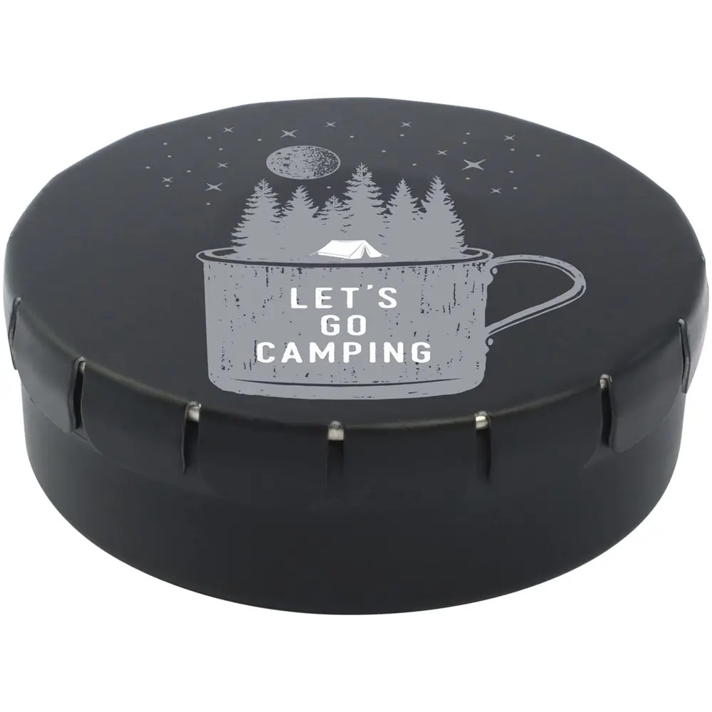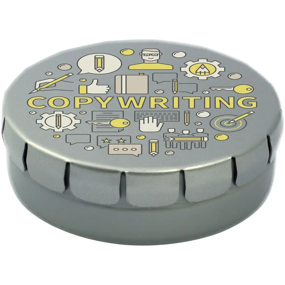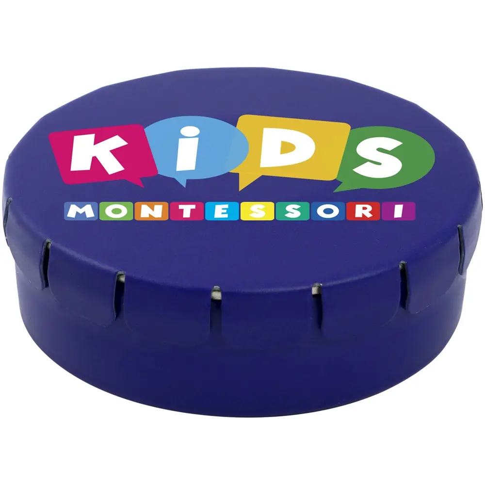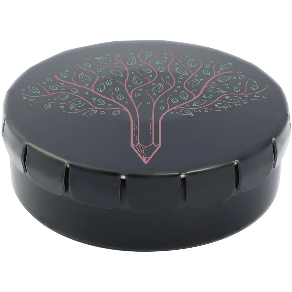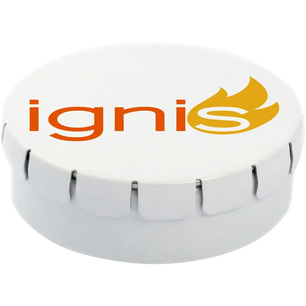 Cinnamon flavour sweets in tin container with easy-press opening. Can be ordered in a wide range of colours and filled with various fillings: mints, extra strong mints, sugar free mints, fruit drops, heart shaped strawberry, cinnamon, lemon and mint sweets, or chocolates. Can be decorated with a full colour digital print on the lid.