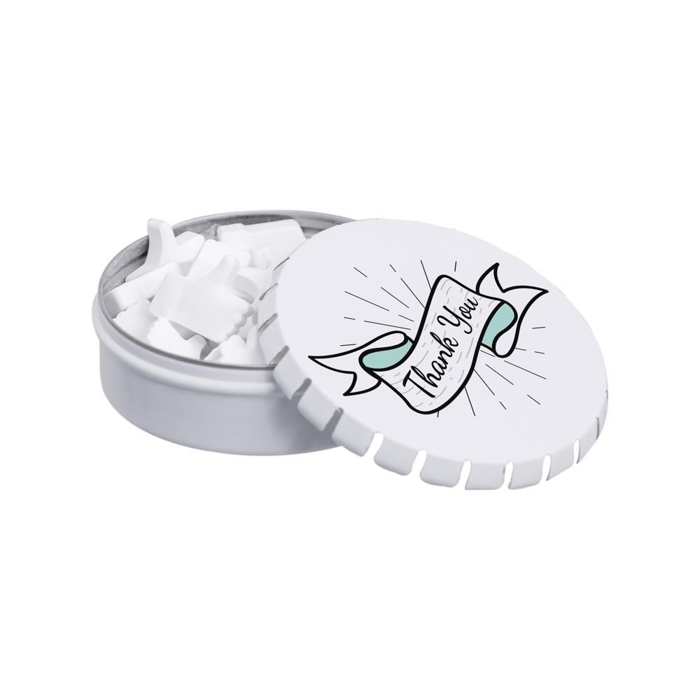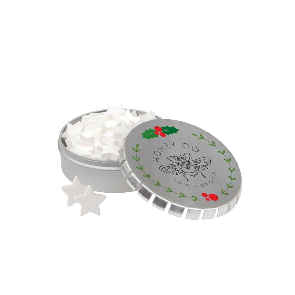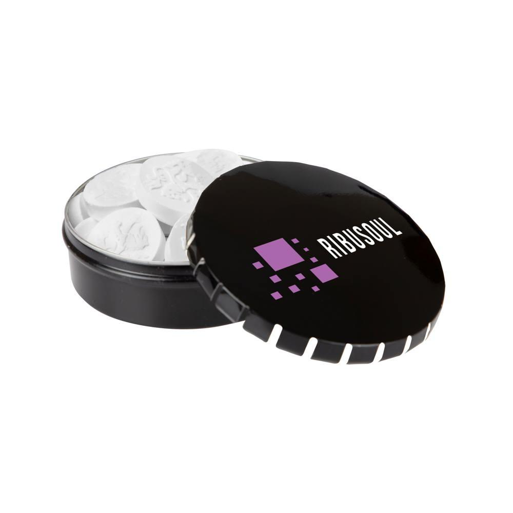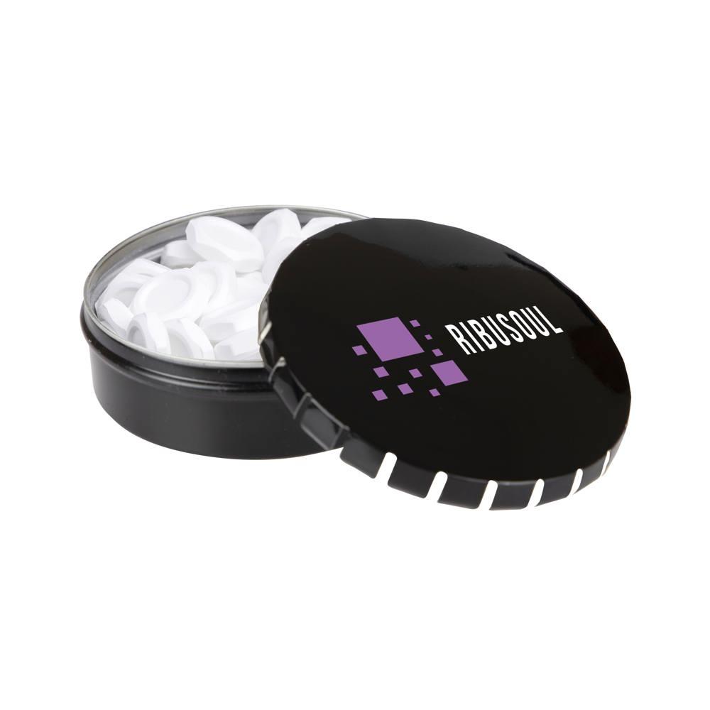 Elevate your brand with our customizable Clic-Clac Tin, filled with approximately 50 grams of Compli'mint shaped mints. This compact 78mm diameter tin offers a secure clic-clac closure to keep mints fresh longer, making it perfect for promotional giveaways at events, trade shows, or client appreciation campaigns.