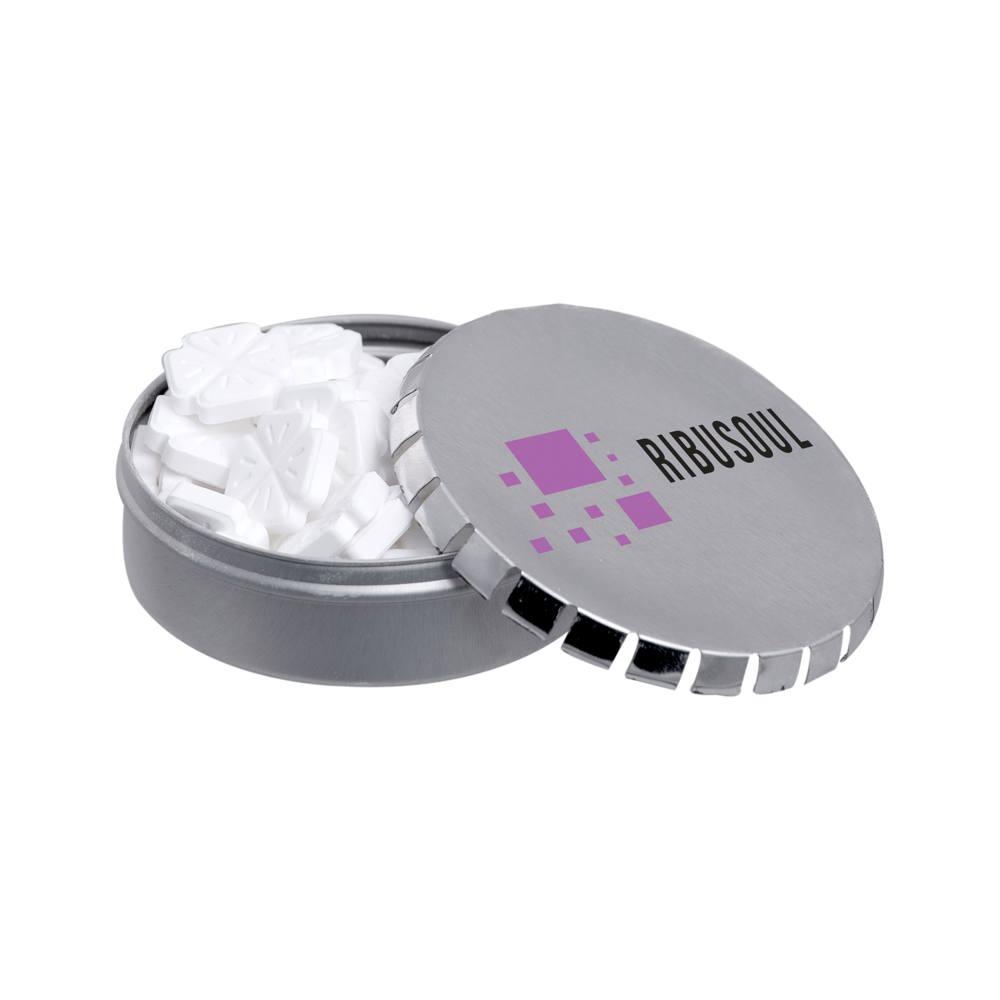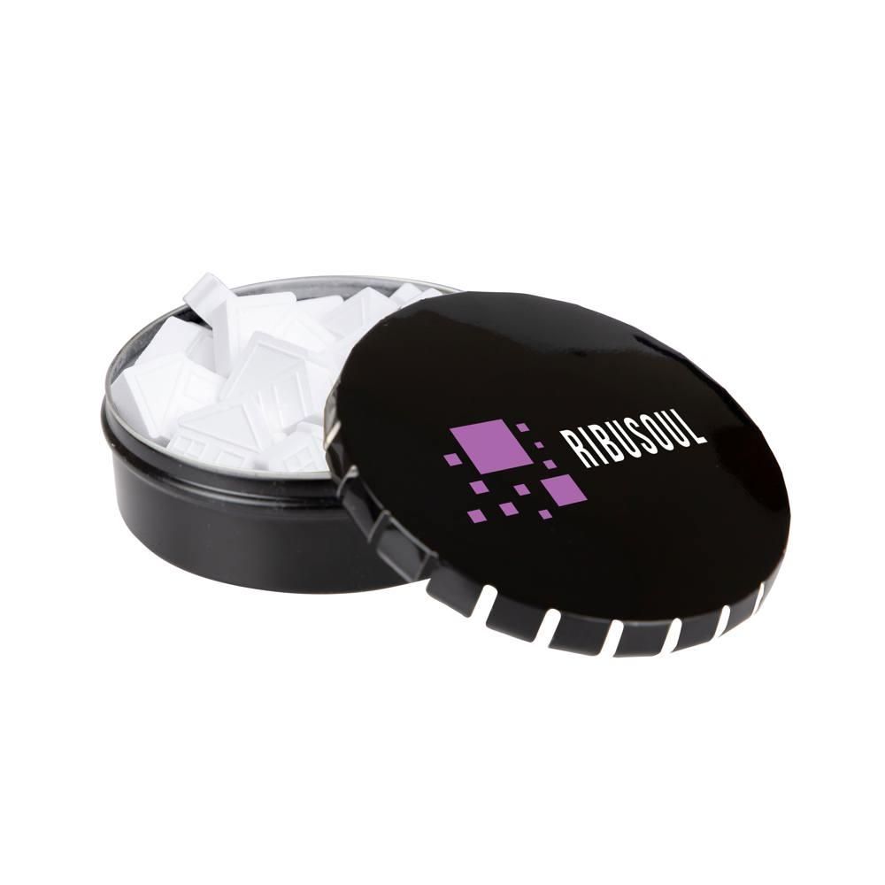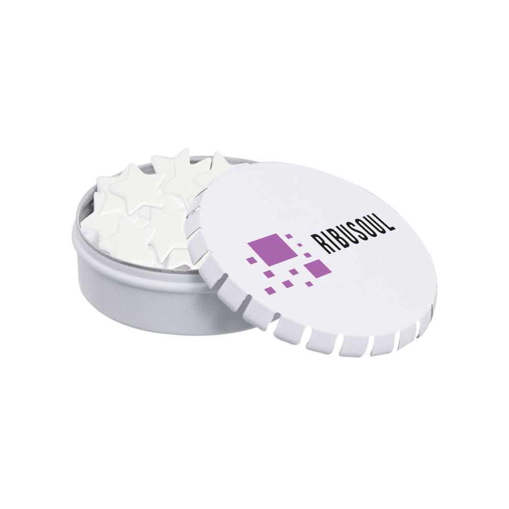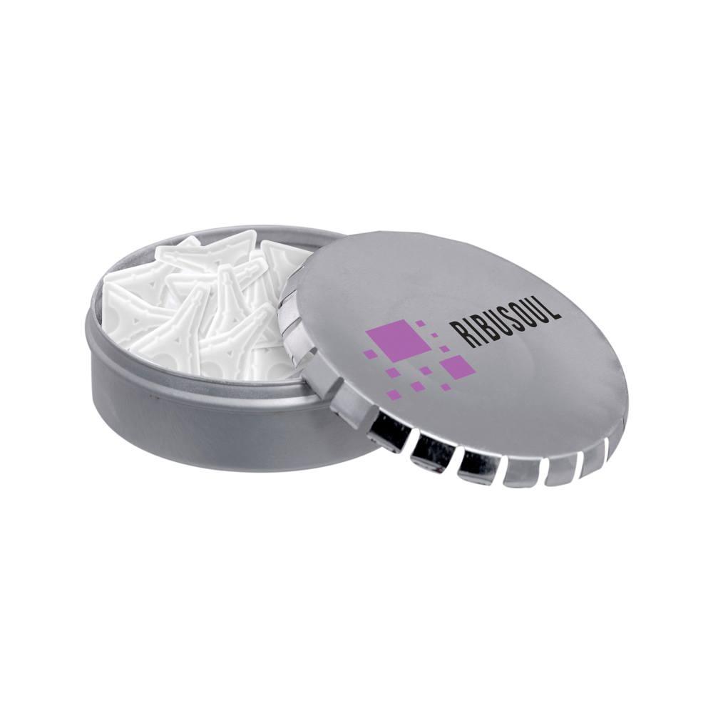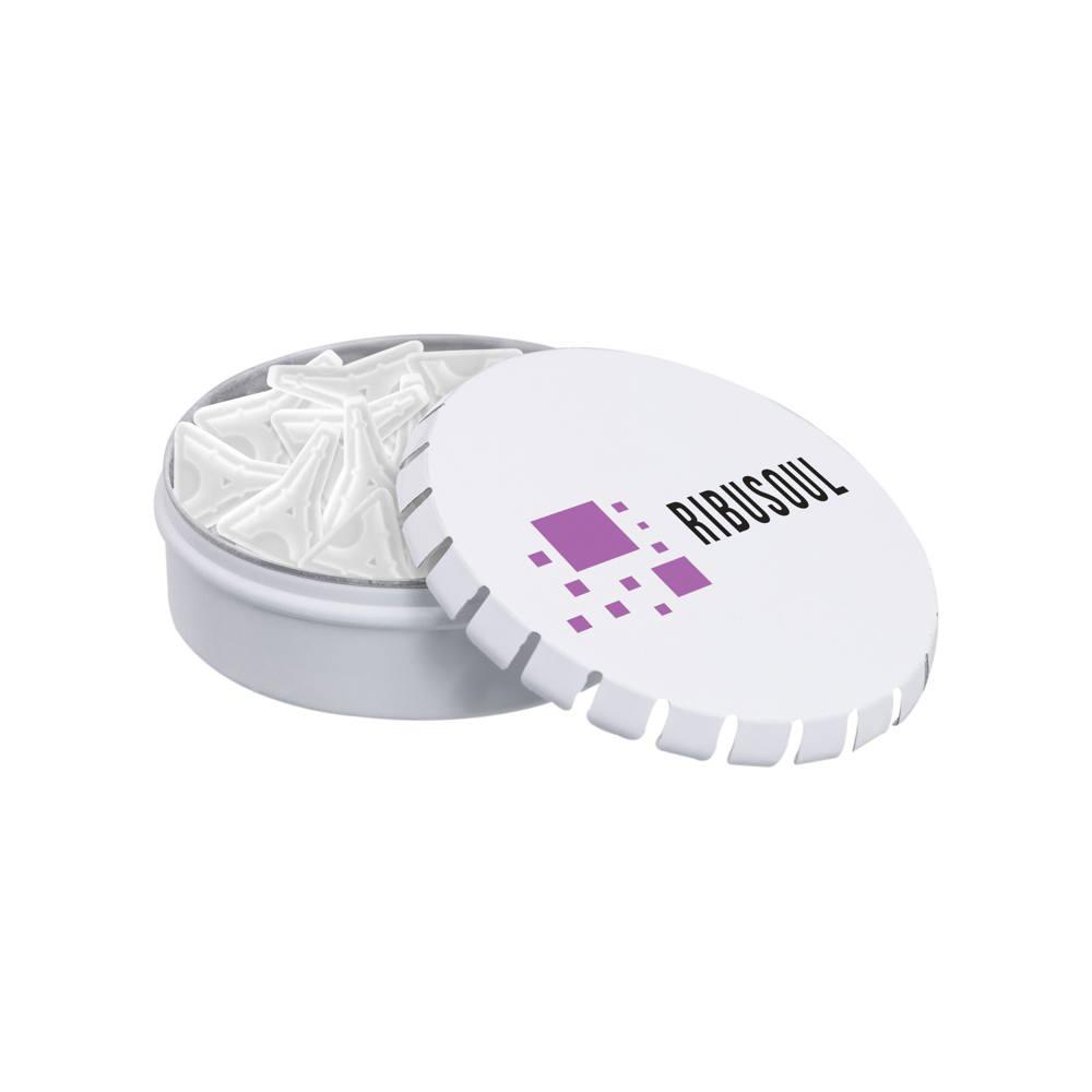Elevate your brand visibility with this compact clic-clac tin, perfectly sized at 78 mm diameter for easy portability. Filled with approximately 50 grams of Compli'mint shaped mints, it offers a fresh, engaging giveaway that keeps your logo in front of customers long after the event.