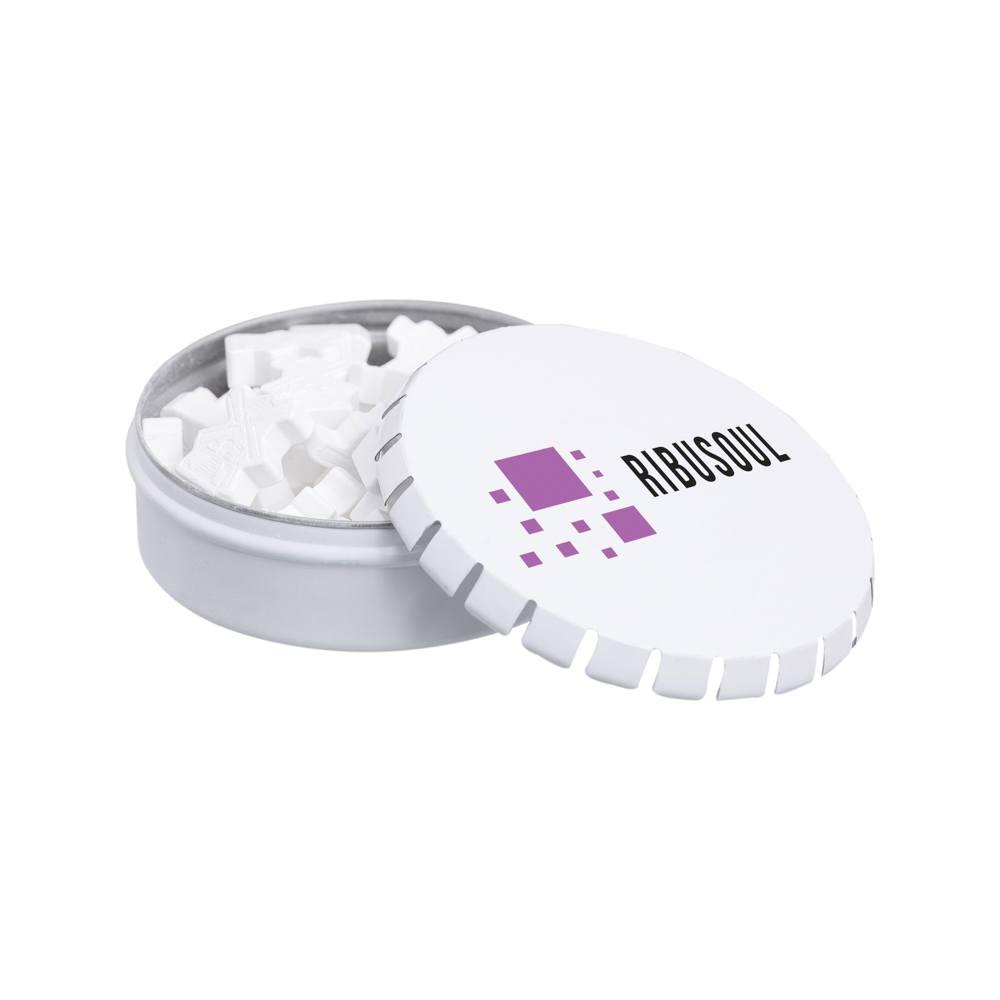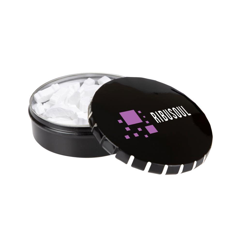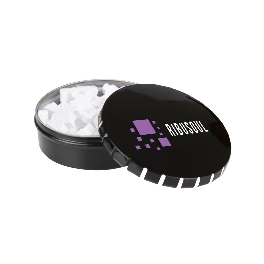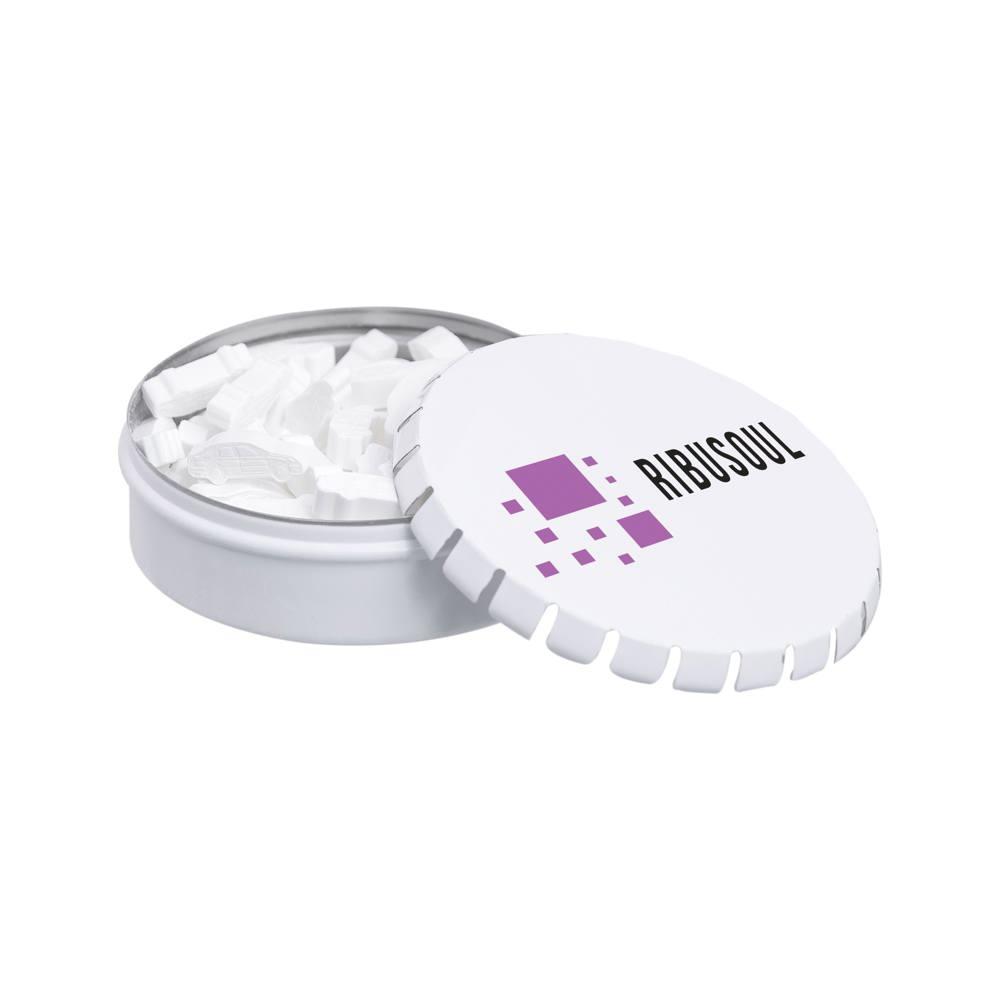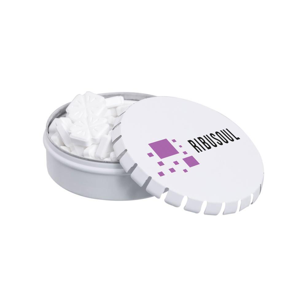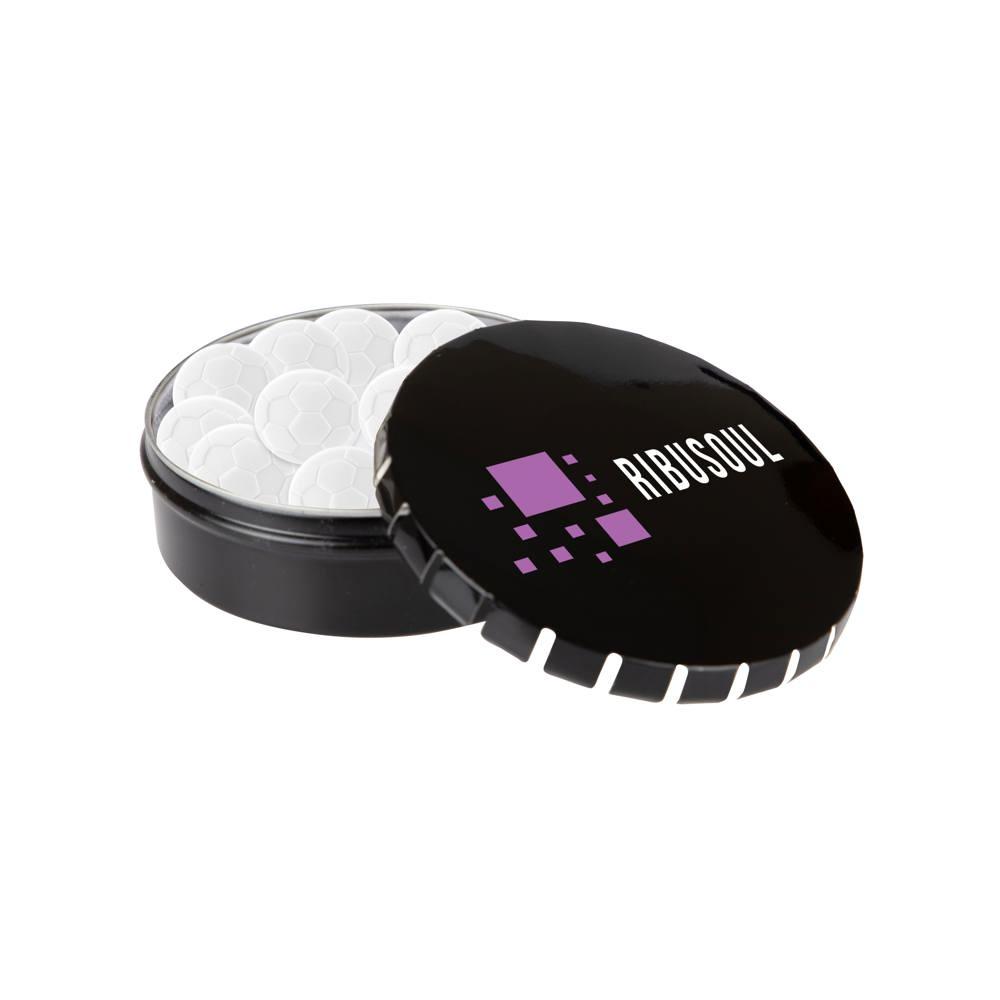 Elevate your brand visibility with this compact clic-clac tin, perfectly sized at 78 mm diameter for easy portability. Filled with approximately 50 grams of Compli'mint shaped mints, it offers a fresh, engaging giveaway that keeps your logo in front of customers long after the event.