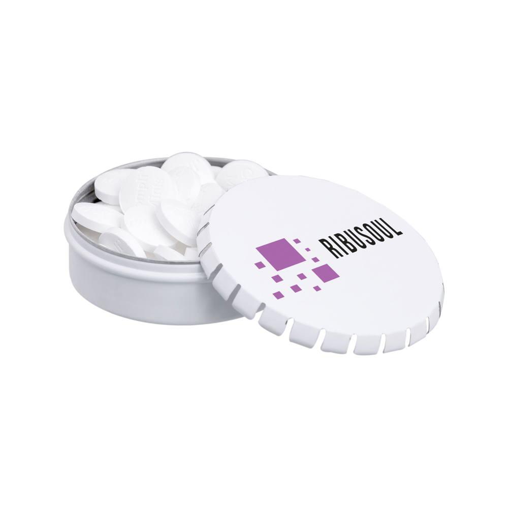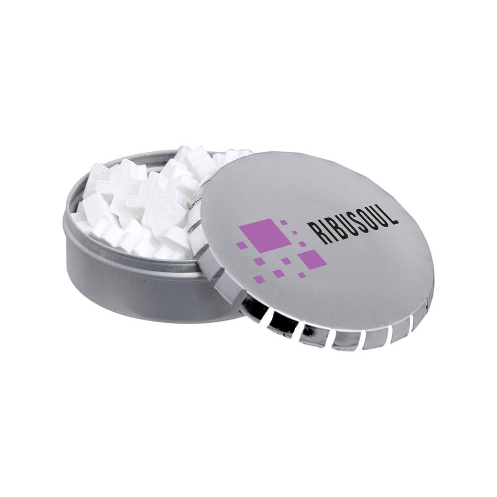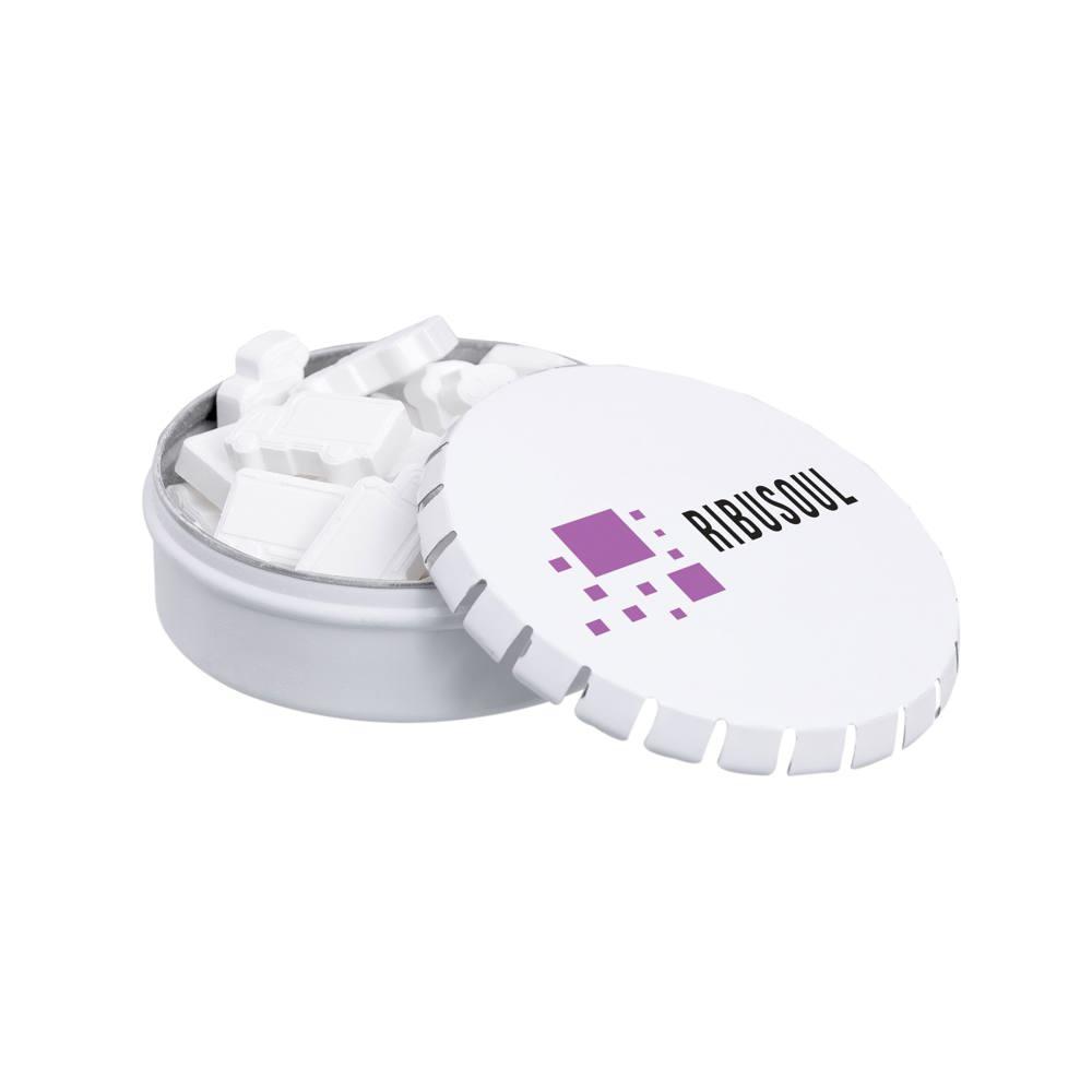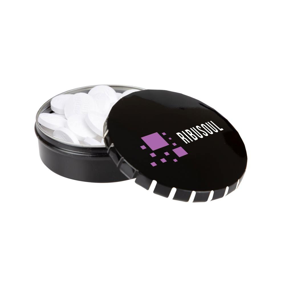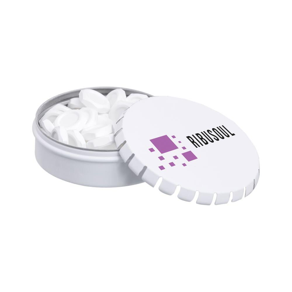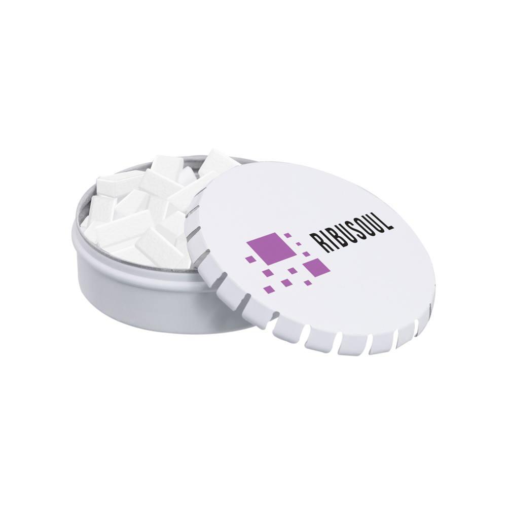 Elevate your brand visibility with this compact clic-clac tin, perfectly sized at 78 mm diameter for easy portability. Filled with approximately 50 grams of Compli'mint shaped mints, it offers a fresh, engaging giveaway that keeps your logo in front of customers long after the event.