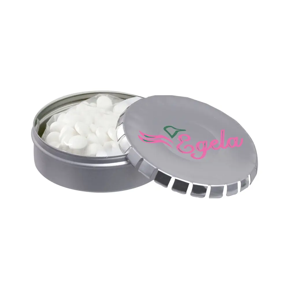 Elevate your brand with the customizable Clic-Clac Tin, a compact promotional essential made from durable tin with a 78mm diameter. Featuring a full-color print on the lid for vibrant logo display, this tin is pre-filled with approximately 50 grams of sugar-free mints, offering a refreshing touch to your giveaways.