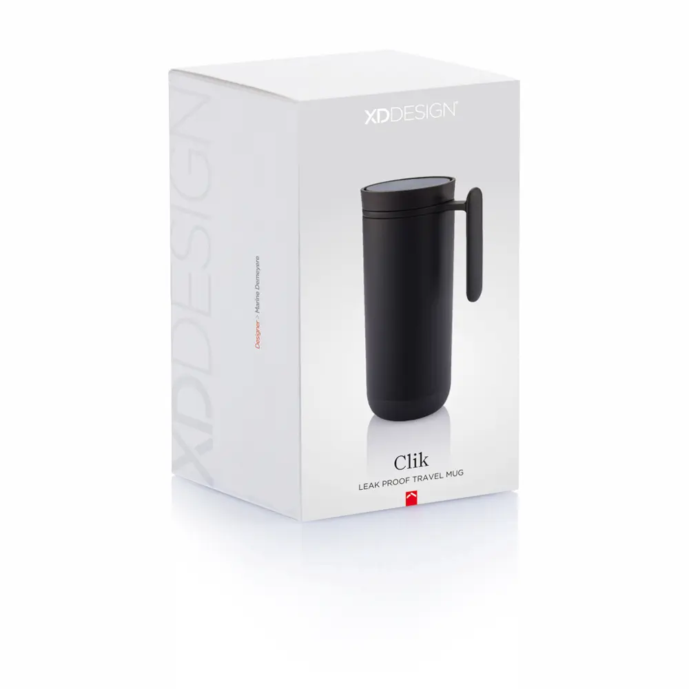 The Clik Leak Proof Travel Mug is an ideal promotional giveaway for marketing professionals and event organizers, perfect for branding with custom logo printing to boost your company's visibility. Its innovative 360-degree drinking lid opens and closes effortlessly with one hand, preventing spills during busy commutes or events. The double-walled construction in durable polypropylene and stainless steel holds 230ml, maintaining drinks hot for up to 3 hours or cold for up to 6 hours, ensuring satisfaction for recipients.