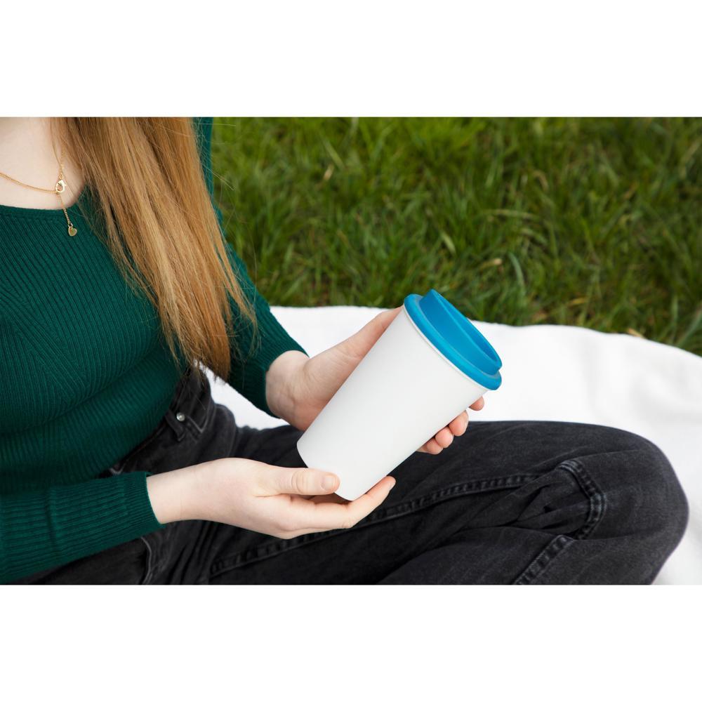 Elevate your brand with the Premium upcycling Coffee mug "Smart To-Go", a sustainable choice crafted from double-walled plastic for superior insulation that keeps beverages hot or cold longer. The outer layer uses recycled polypropylene sourced from elastocare mask production leftovers—transforming waste into a high-quality, eco-friendly product that showcases your commitment to sustainability.