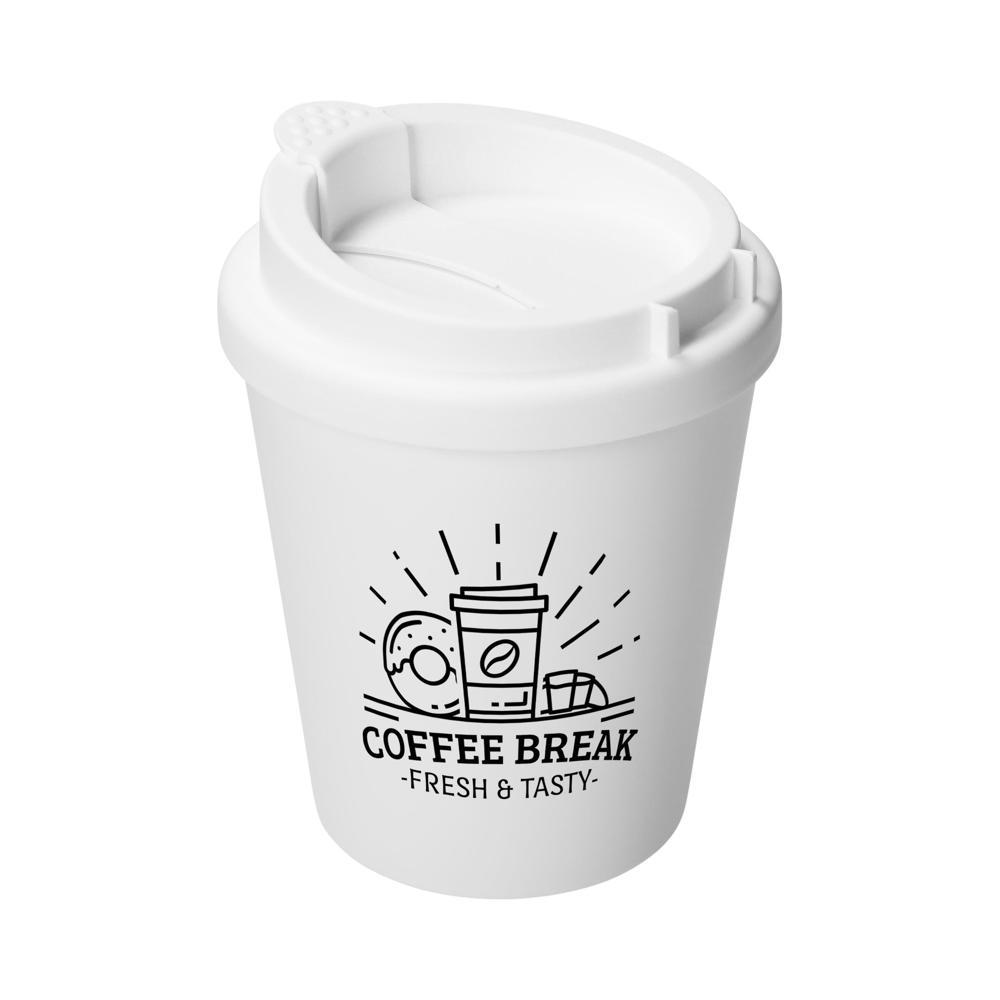 Elevate your brand visibility with the compact Coffee mug "PremiumPlus" small, a double-walled plastic to-go mug designed for on-the-move professionals. Its 0.25-liter capacity and 95mm diameter ensure it fits perfectly in standard cup holders, making it ideal for events, trade shows, or client giveaways.