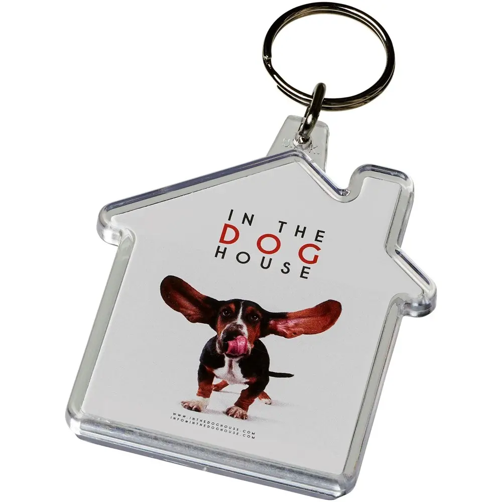 Elevate your brand's visibility with our customizable house-shaped keychain, perfect for promotional giveaways and events. Crafted from durable GPPS plastic with a paper insert for high-quality logo printing (5.9 cm x 5.6 cm area), this compact accessory (7 x 0.6 x 6.1 cm) features a metal split ring for secure attachment and a flat profile ideal for cost-effective mailings.