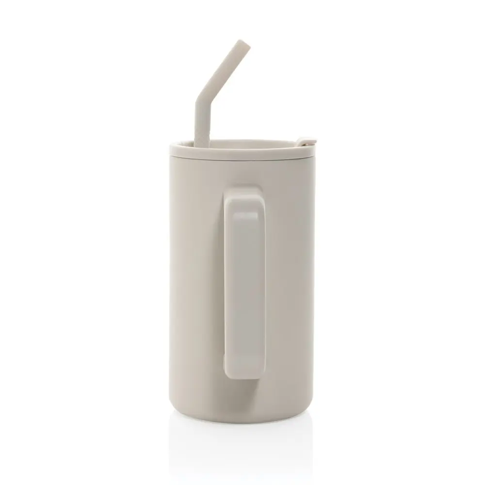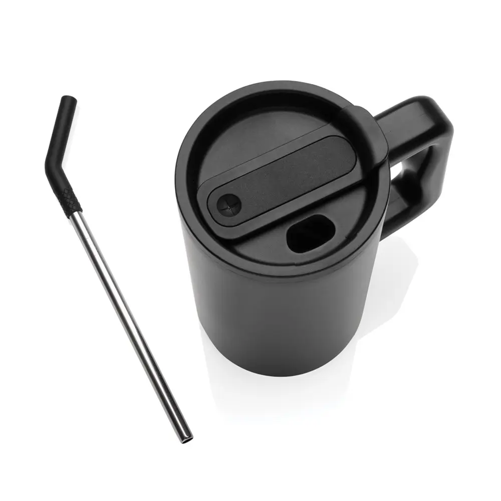 Equipped with a secure screw-on lid featuring a drinking spout and optional straw with silicone tip, this double-walled, vacuum-insulated mug maintains heat for up to 5 hours and cold for up to 15 hours. Ideal for hot coffee during meetings or ice-cold water at events, it adapts to any professional setting.