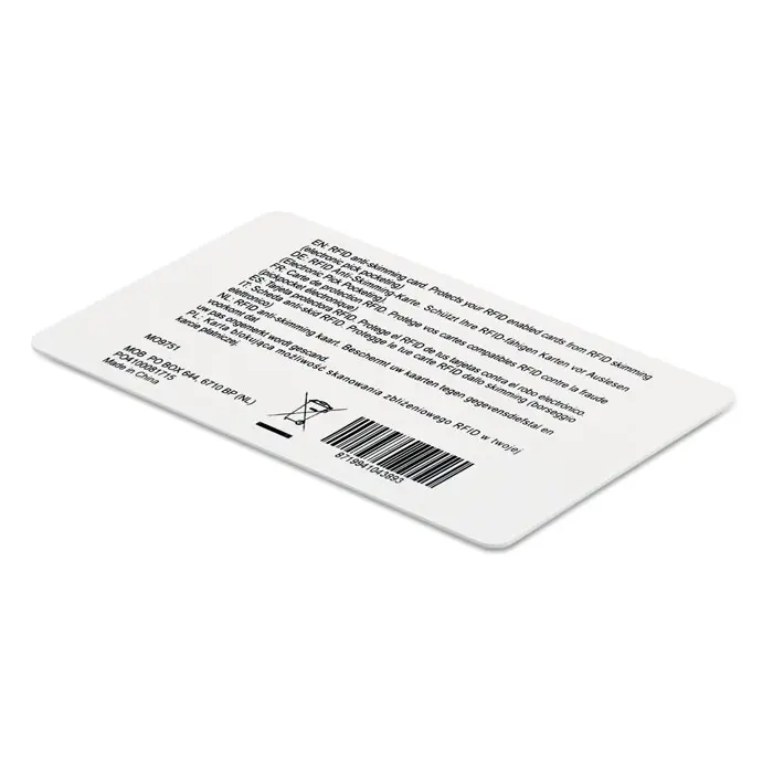 Protect your clients' sensitive data from unauthorized access with our RFID anti-skimming cards. These slim protectors shield 13.56 MHz cards—such as those for public transport, banking, or credit payments—from electronic theft within a 2-3 cm radius using an electromagnetic field. Crafted from durable PVC at just 0.9 mm thick, they fit effortlessly into wallets without adding bulk.