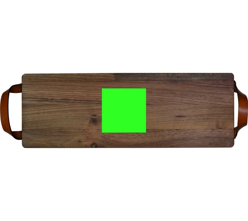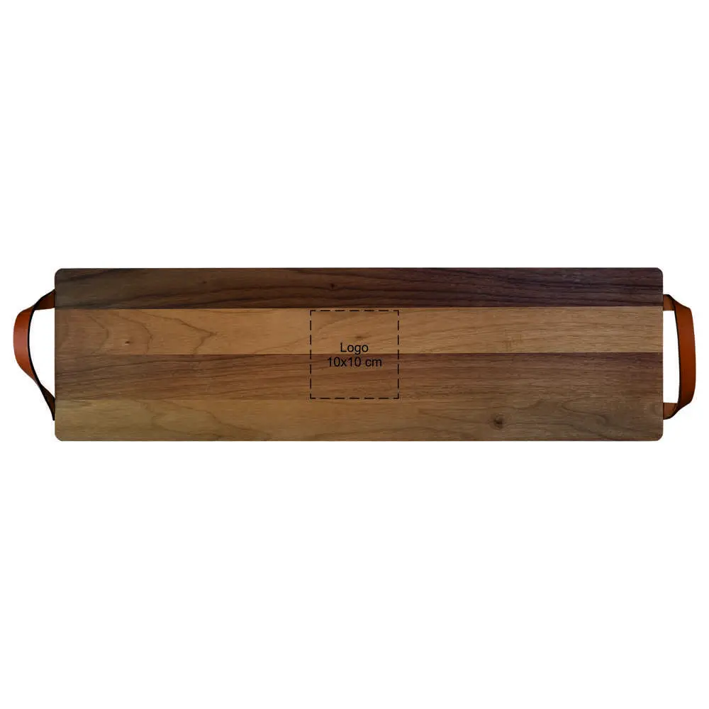 Elevate your brand with our personalized walnut cutting board featuring luxurious leather handles. Crafted from sustainable bio-certified walnut wood, this durable 69x19 cm serving board is ideal for cheese platters, snacks, and delicacies, offering ample space for impressive displays.