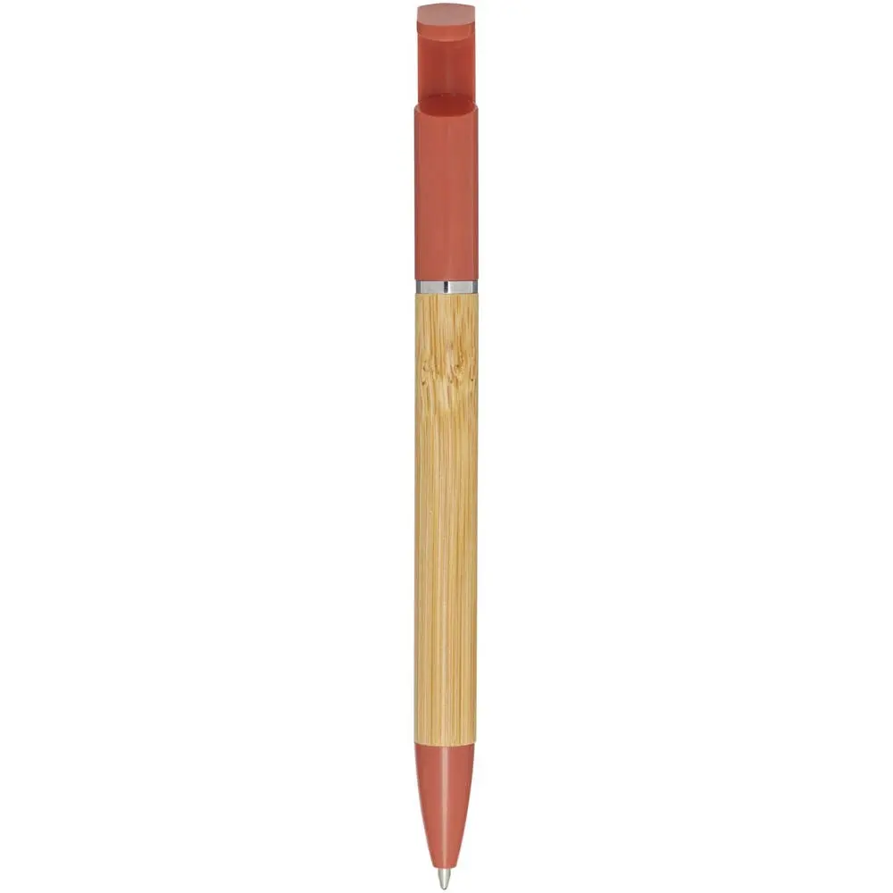 Elevate your promotional giveaways with this eco-friendly bamboo ballpoint pen that doubles as a convenient phone holder. Crafted from responsibly sourced FSC-certified bamboo for the barrel, with recycled plastic accents on the button and mid-ring, and a durable brass tip, it's a thoughtful choice for businesses committed to sustainability.