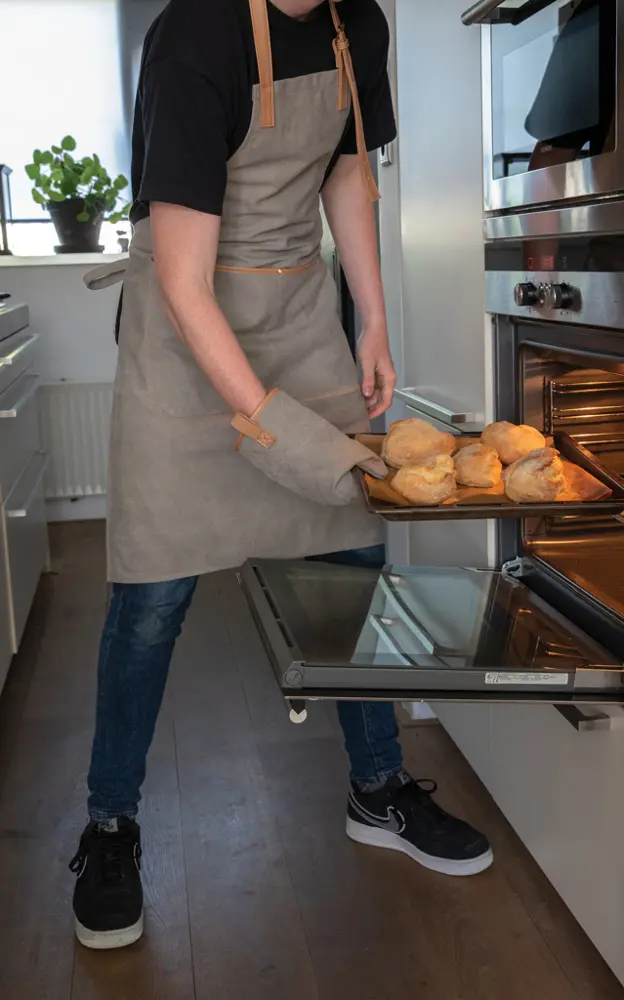 Crafted from heavy-duty 16oz canvas with a separate thumb for secure grip, this oven glove meets EN 407 standards for thermal protection. The decorative PU detail adds a professional touch, ensuring it withstands daily handling without compromising safety.