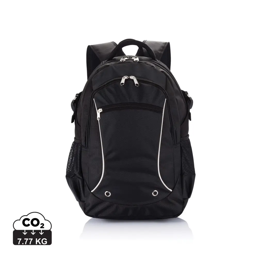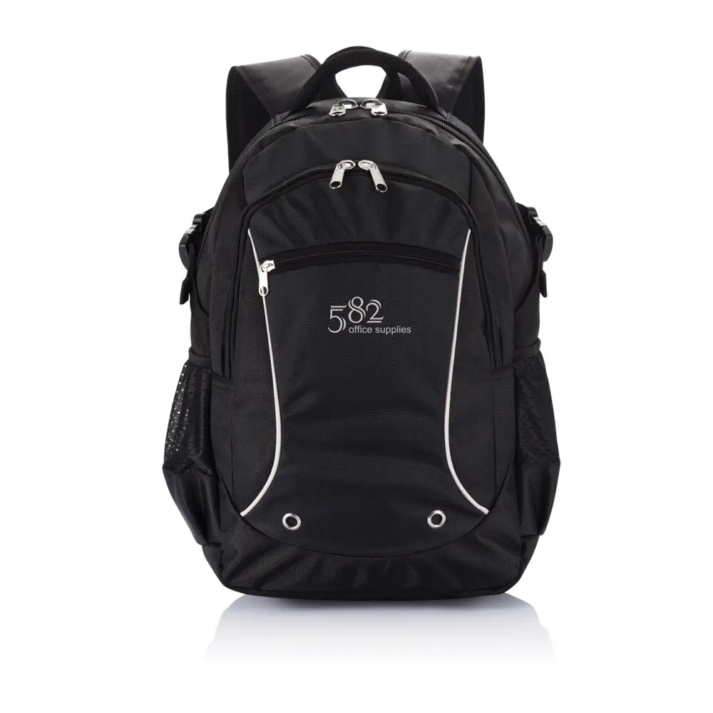 This backpack features a zippered front pocket with organizer for easy access to essentials like pens, phones, and business cards. The spacious main compartment includes a padded pocket that fits up to 15.6-inch laptops, offering reliable protection during commutes or travel. Reflective piping enhances visibility in low-light conditions, adding a safety element for users. Two side mesh pockets accommodate water bottles or umbrellas, and the overall 20L capacity ensures ample space for daily needs. Made from durable polyester without PVC, it complies with strict standards including U.S. lead content, SVHC directive, nickel release, cadmium, AZO dyes, and chlorinated paraffins for eco-conscious branding.