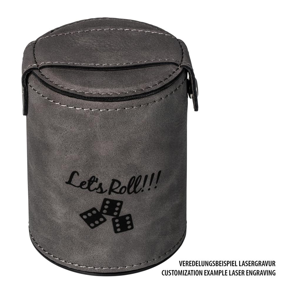 Bring joy and engagement to your events with this custom dice cup, perfect for marketing professionals and event organizers. Featuring a lockable cube tray in the base, hinged lid, and snap fastener, it keeps five dice secure and ready for instant fun—ideal for on-the-go use at trade shows, client meetings, or home entertainment.
