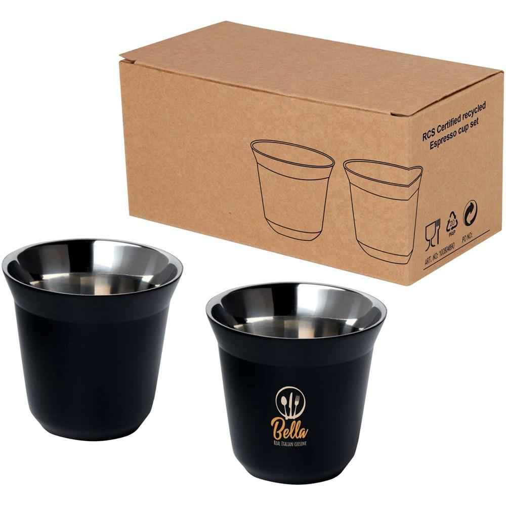 Elevate your brand visibility with the Duo 80 ml Espresso Cup Set, featuring two double-walled RCS certified stainless steel cups that provide superior insulation to keep espresso hot longer. With an 80 ml capacity and 62 mm diameter, these premium cups deliver a professional coffee experience perfect for promotional giveaways.