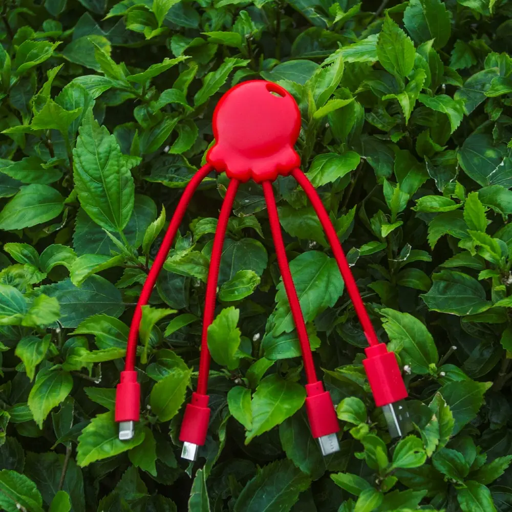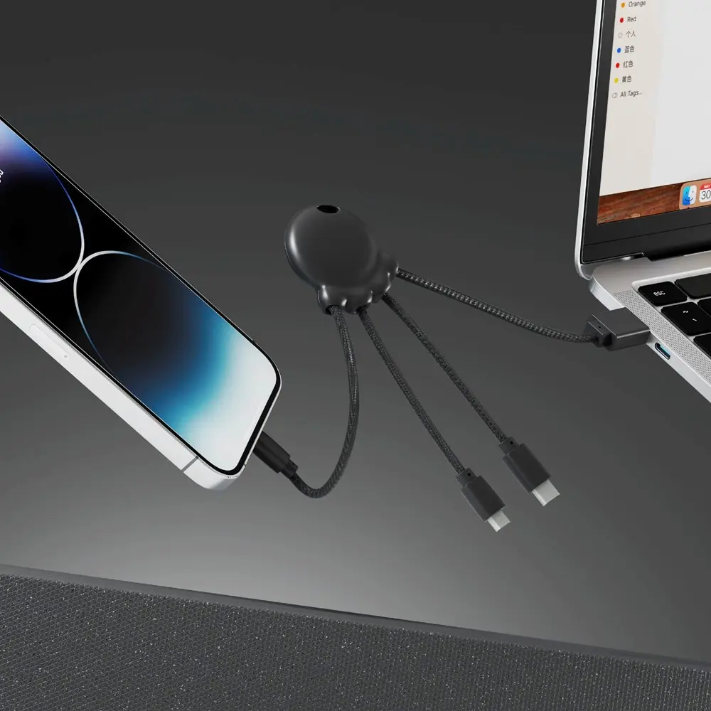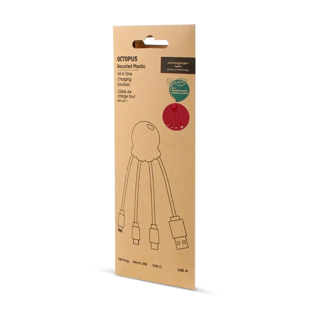 Elevate your brand's eco-conscious image with the Eco Octopus Charging Cable, a versatile and sustainable multi-charger perfect for promotional giveaways. Crafted from RPET cables and recycled plastic body, it boasts 61% recycled content based on item weight, ensuring an environmentally friendly choice that aligns with corporate sustainability goals.