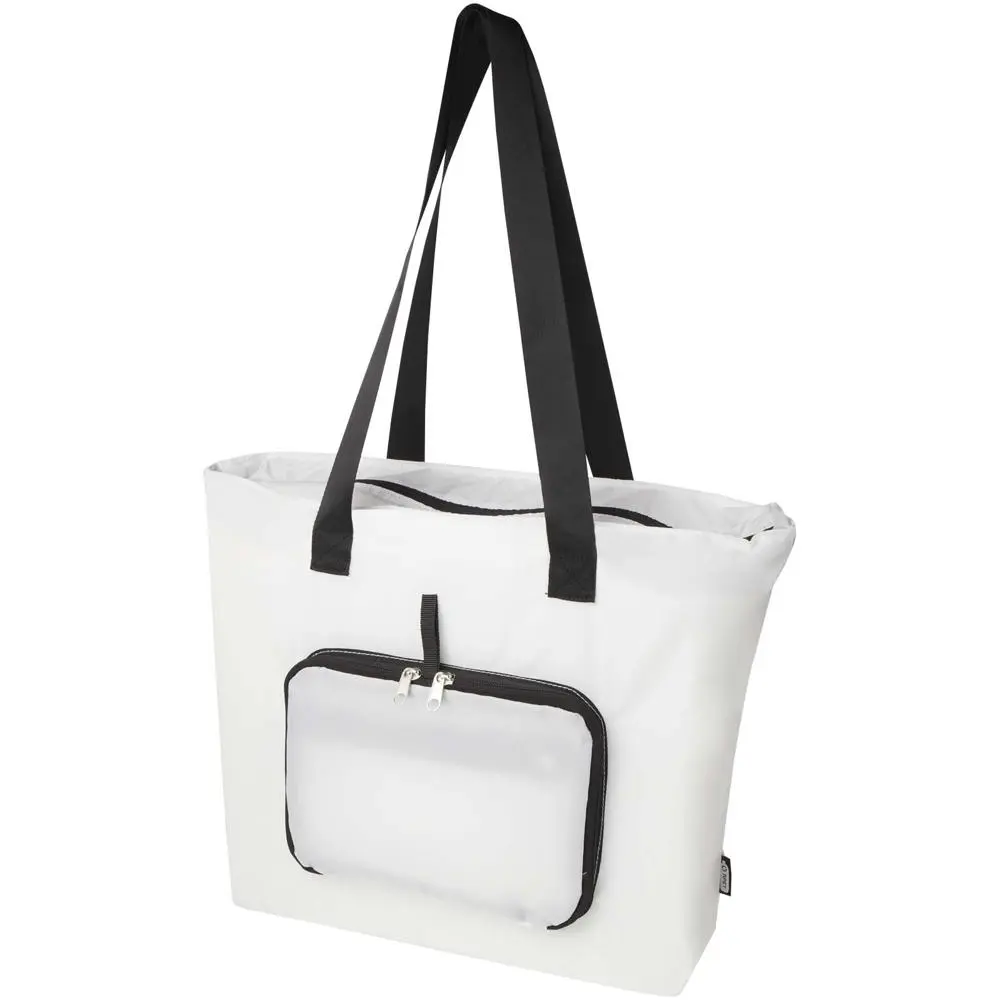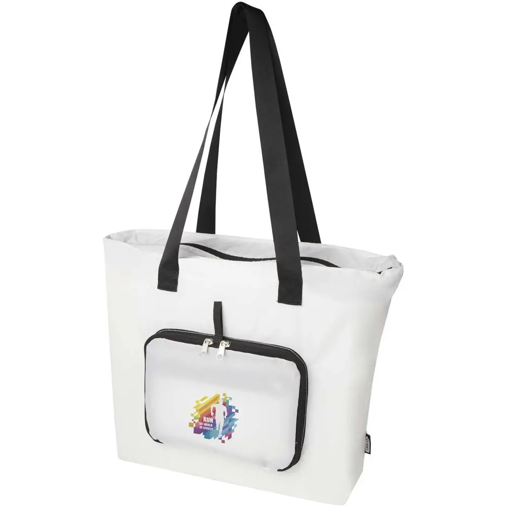 Discover the EcoFold Foldable Tote Bag 16L, a versatile promotional powerhouse for marketing professionals and event organizers. Crafted from GRS-certified recycled polyester, this lightweight, durable bag folds compactly into a handy pouch with a webbing loop for effortless carrying—ideal for on-the-go giveaways or spontaneous use. It features a spacious 16L zipped main compartment for essentials, a secure front zip pocket, and comfortable long webbing handles for easy transport. Sized at 48 x 37 x 12 cm, it's perfect for bulk customization with your logo, boosting brand visibility while showcasing your commitment to sustainability. Impress clients at events or trade shows with this eco-friendly essential that combines practicality and promotional impact.