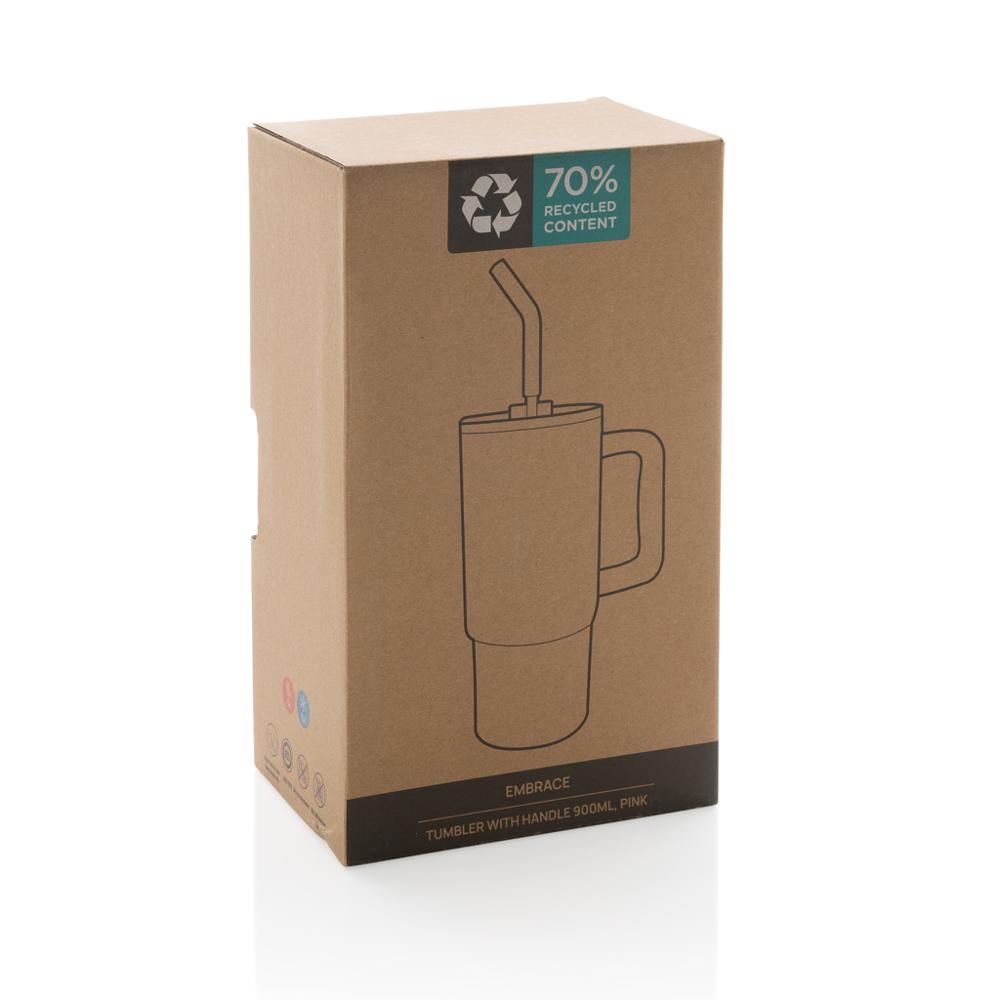 Elevate your promotional giveaways with this spacious 900ml tumbler, designed for ultimate portability and style. Its comfort-grip handle and slim 97mm diameter base fit most cup holders, making it ideal for busy marketing events, client meetings, or on-the-go recipients. Crafted from durable recycled stainless steel with 70% total recycled content and RCS certification for a verified sustainable supply chain, this tumbler appeals to eco-conscious brands.