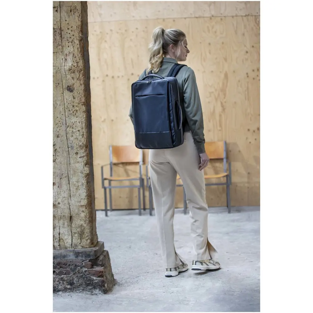 This backpack offers expanded capacity up to 35 litres, equivalent to a carry-on, making it seamless for travel-heavy professionals. Crafted from water-repellent RPET with premium PU accents and RPET lining, it ensures longevity in demanding environments. Highlights include:
